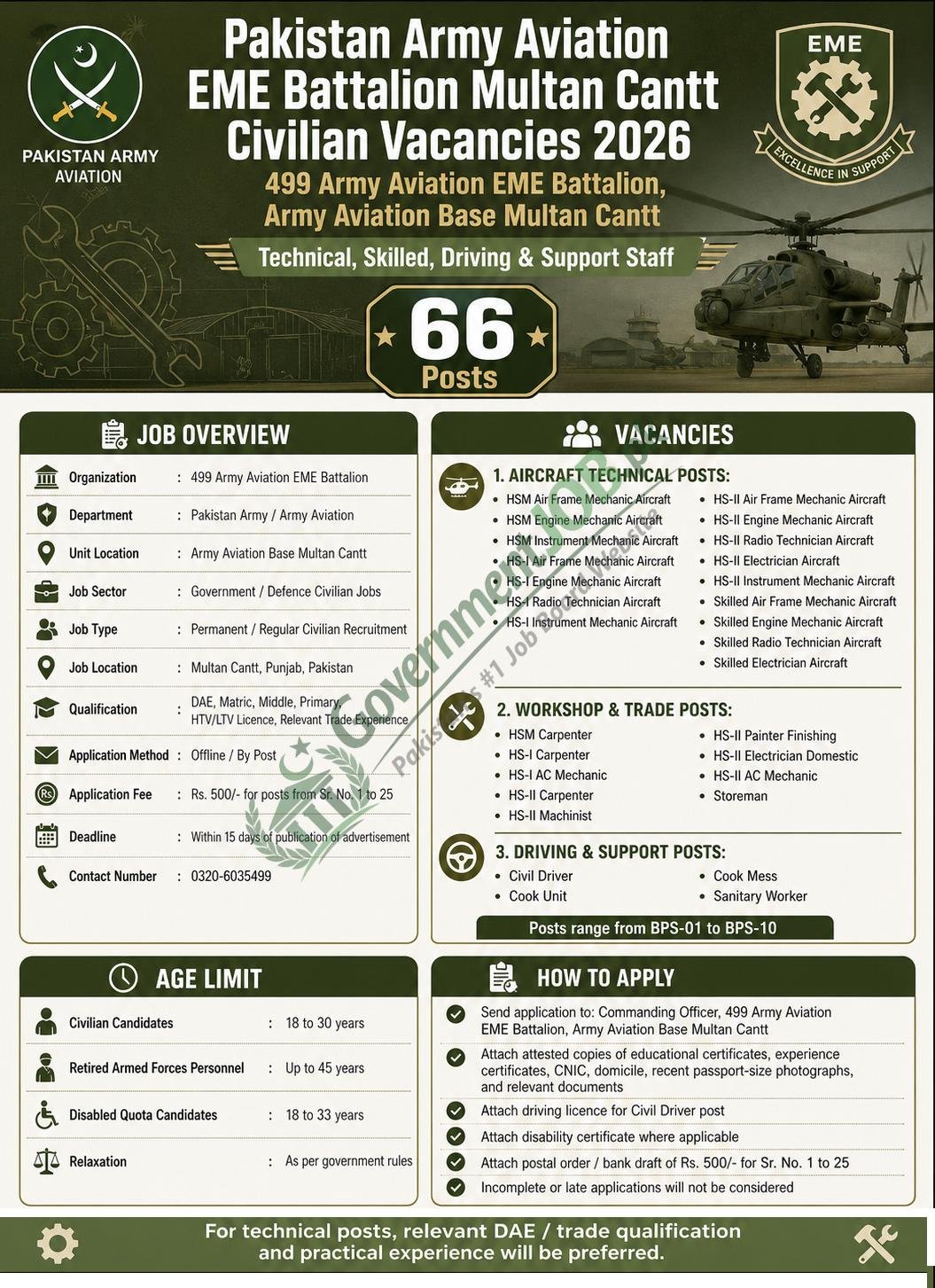 499 Army Aviation EME Battalion, Army Aviation Base Multan Cantt has announced new civilian government jobs 2026 for eligible Pakistani candidates. Applications are invited for multiple technical, aviation maintenance, skilled trade, clerical/store, driving, cooking and support staff vacancies. These positions are suitable for candidates having relevant technical qualification such as DAE, Matric, Middle, Primary, HTV/LTV driving licence, trade experience and practical skill in aircraft maintenance or workshop-related fields. Candidates who meet the required qualification, experience, age limit and quota conditions should submit their applications to the concerned unit within the deadline mentioned in the advertisement.