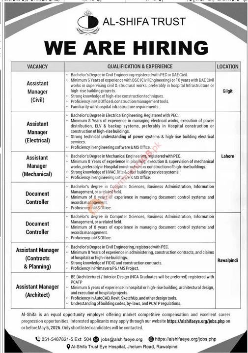 Al-Shifa Trust announces career opportunities in Gilgit, Lahore, and Rawalpindi for engineering, contracts, architecture, and document control professionals