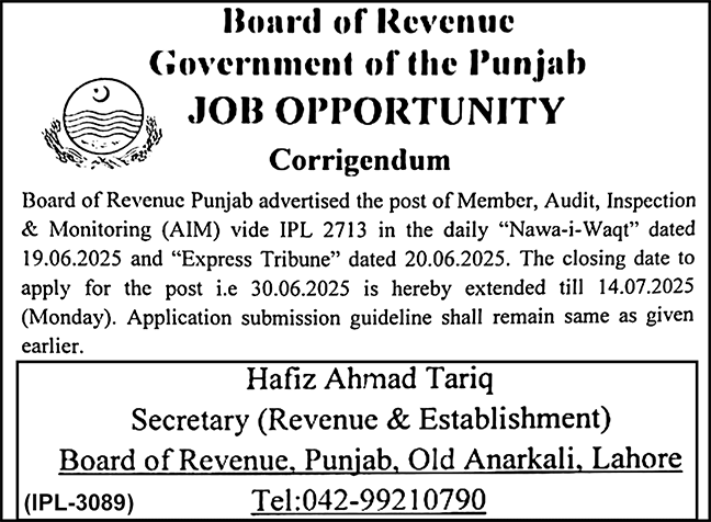 The Board of Revenue, Government of the Punjab has issued a corrigendum regarding its earlier job advertisement for the post of Member (Audit, Inspection & Monitoring – AIM).