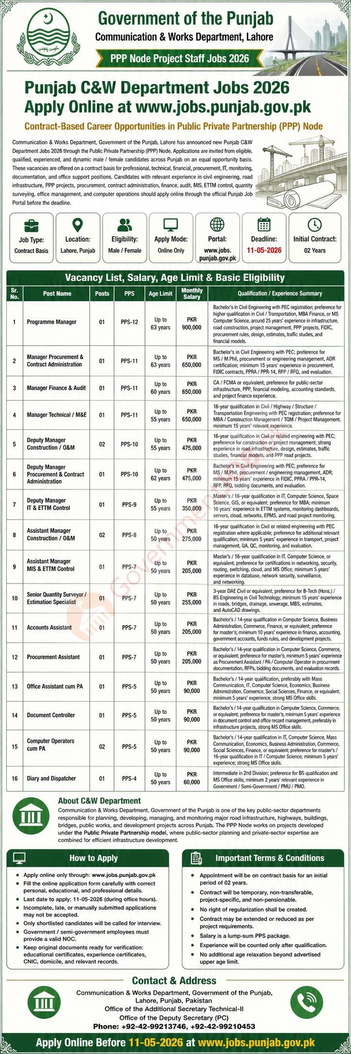 Punjab C&W Department has announced multiple vacancies under the PPP Node, including Programme Manager, Manager Procurement, Manager Finance, Manager Technical, Deputy Managers, Assistant Managers, Quantity Surveyor, Accounts Assistant, Procurement Assistant, Office Assistant, Document Controller, Computer Operators, and Diary & Dispatcher.