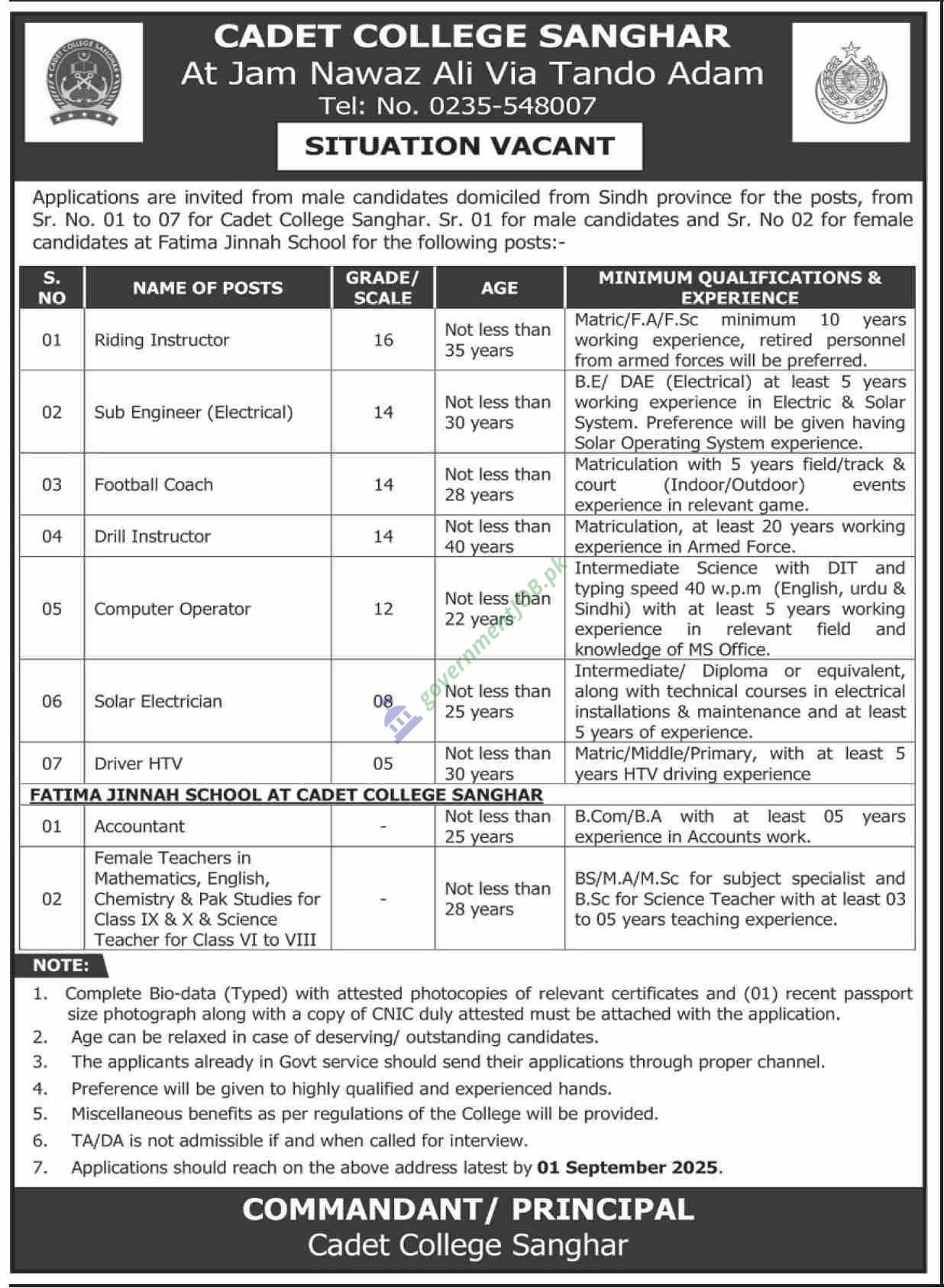 Cadet College Sanghar—situated at Jam Nawaz Ali via Tando Adam, Sindh—and its Fatima Jinnah School campus invite Sindh-domiciled applicants for a mix of teaching and support posts. Male candidates can apply for Riding Instructor (BPS-16), Sub Engineer Electrical (BPS-14), Football Coach (BPS-14), Drill Instructor (BPS-14), Computer Operator (BPS-12), Solar Electrician (BPS-08) and HTV Driver (BPS-05), while female openings cover Accountant plus Teachers in Mathematics, English, Chemistry, Pakistan Studies (Class IX-X) and Science (Class VI-VIII). Age floors start at 22–40 years, and qualifications range from Matric to B.E./M.Sc, paired with the specified field experience.