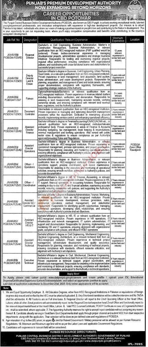 The Punjab Central Business District Development Authority (PCBDDA)—widely known as CBD Punjab—has announced multiple career opportunities for CBD Potohar. The authority is recruiting experienced professionals for senior and mid-career roles including Regional Director, Deputy Director (Estate & Land), Document Controller, Assistant Director (Finance), Assistant Director (Operations), Officer-I (Operations), Officer-I (Coordination), Assistant Director (BD/Commerce), Assistant Director (HR & IT), Assistant Director (Legal), Assistant Director (Technical), and Executive (Technical). These are full-time positions based primarily at the CBD Punjab Zonal Office, Rawalpindi and the Head Office, Lahore (Punjab, Pakistan).