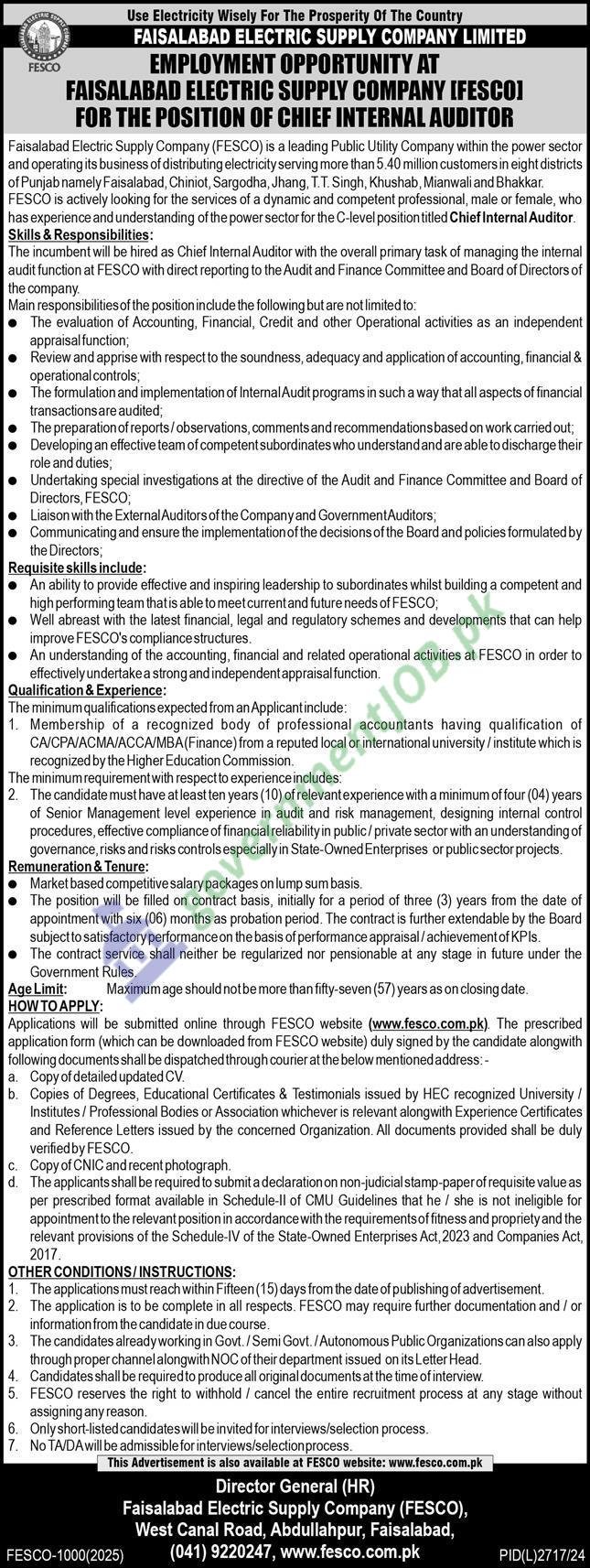 Faisalabad Electric Supply Company (FESCO), a reputable government-owned public utility enterprise providing electricity distribution services across eight districts of Punjab—Faisalabad, Chiniot, Sargodha, Jhang, T.T. Singh, Khushab, Mianwali, and Bhakkar—is currently inviting applications from highly qualified, experienced, and dedicated professionals for the senior-level position of Chief Internal Auditor. This strategic position offers a market-based salary package and requires a candidate with a robust understanding of auditing standards, internal control systems, risk management, and regulatory compliance within the power or public sector.
