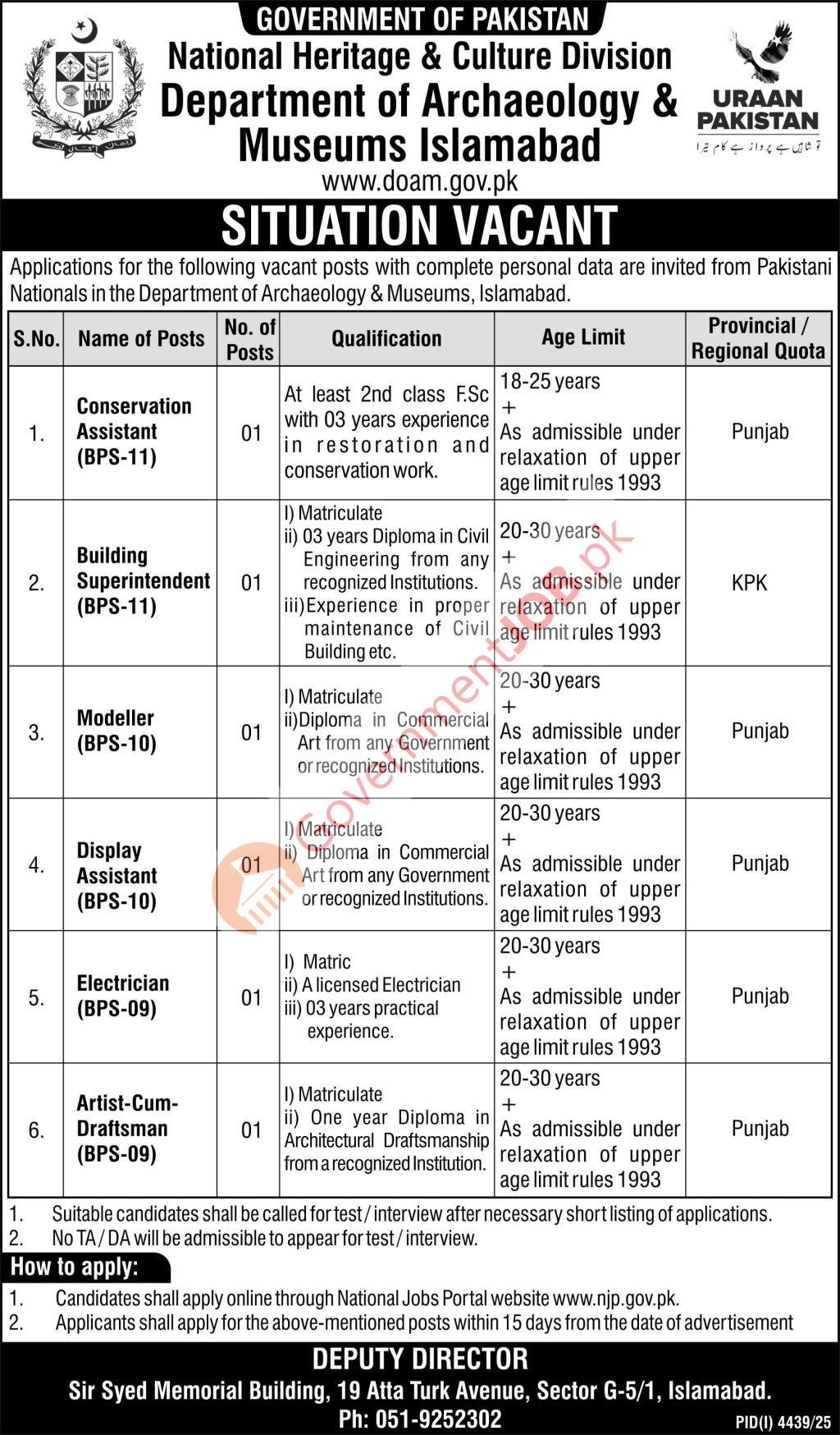 Department of Archaeology & Museums Islamabad Jobs 2025 — Conservation Assistant, Building Superintendent, Modeller, Display Assistant, Electrician, Artist-Cum-Draftsman (BPS-11 to BPS-09)