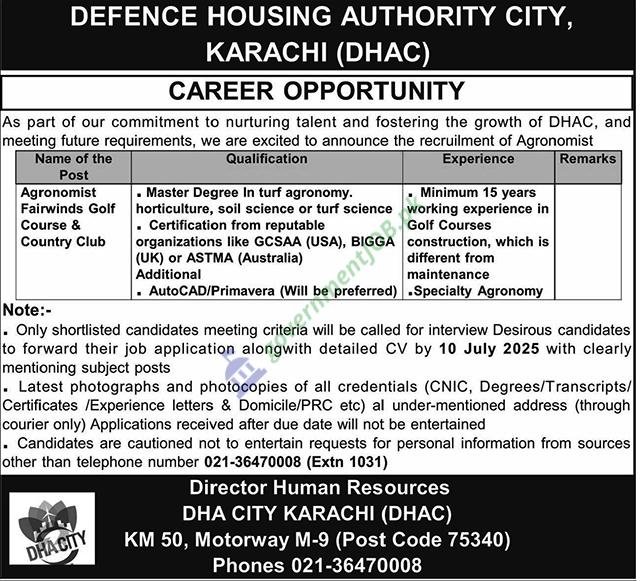 | Agronomist Fairwinds Golf Course & Country Club | Master’s in Turf Agronomy, Horticulture, Soil Science, or Turf ScienceCertification from GCSAA, BIGGA, ASTMA preferredProficiency in AutoCAD/Primavera (preferred) | Minimum 15 years in Golf Course construction (not maintenance) | Not Specified | DHA City, Karachi |