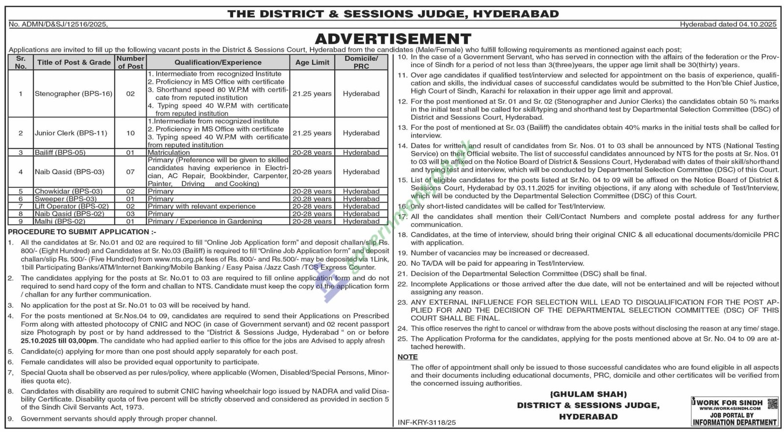 Looking for stable, merit-based government careers in Sindh? The District & Sessions Court, Hyderabad has announced multiple BPS-02 to BPS-16 vacancies for Stenographer, Junior Clerk, Bailiff, Naib Qasid, Chowkidar, Sweeper, Lift Operator, and Mali. These are regular court establishment posts under the District Judiciary. The recruitment covers male and female candidates holding Hyderabad domicile/PRC with age limits mostly 20–28 years (and 21–25 years for clerical/steno posts). Initial screening for Sr. 1–3 will be conducted through NTS (National Testing Service) followed by skill tests and interviews by the Departmental Selection Committee (DSC) of the Court in Hyderabad.