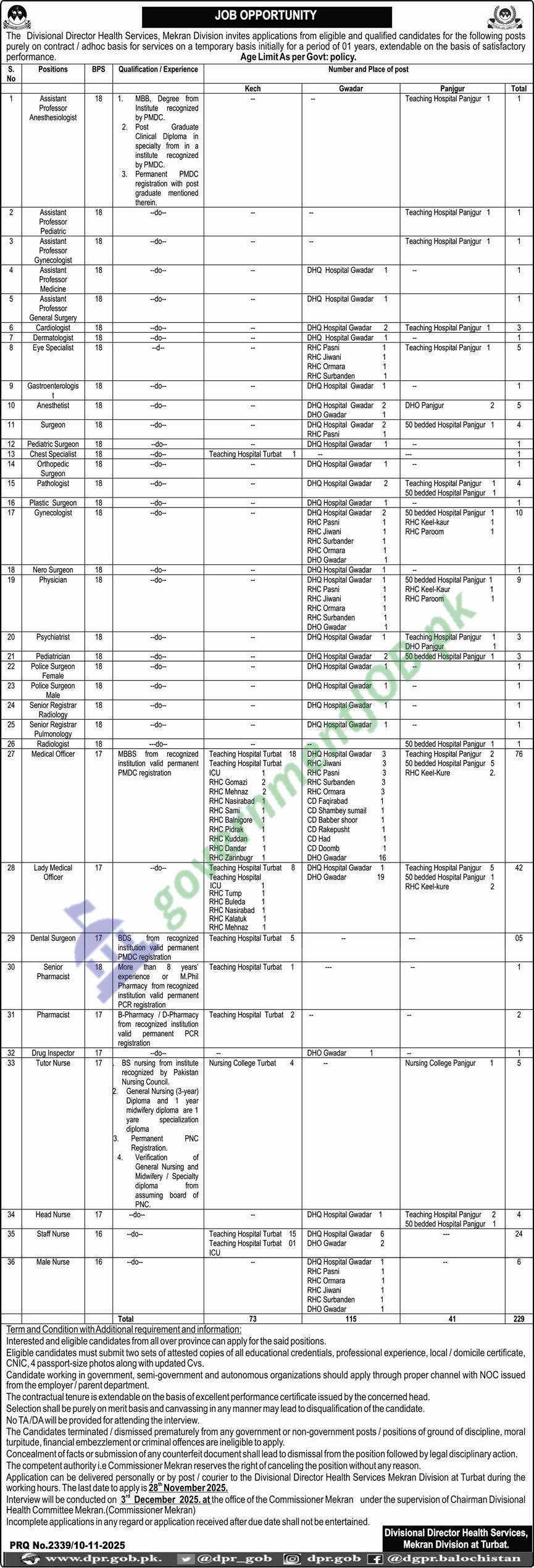 | Specialists / Consultants | Cardiologist, Dermatologist, Eye Specialist, Gastroenterologist, Anesthetist, Surgeon, Pediatric Surgeon, Chest Specialist, Orthopedic Surgeon, Pathologist, Plastic Surgeon, Gynecologist, Neuro Surgeon, Physician, Pulmonologist, Psychiatrist, Pediatrician, Police Surgeon (Female) (mostly BPS-18) | MBBS + FCPS/FRCS/MD/MS/MCPS (as relevant) with valid PMDC/PMC registration | — | DHQ Hospital Gwadar, DHQ Panjgur, Teaching Hospital Panjgur, 50-Bedded Hospitals & multiple RHC/RHQ sites (Pasni, Jiwani, Ormara, Surbander, Rekodiq, Keel-Kaur, Paroom, etc.) |