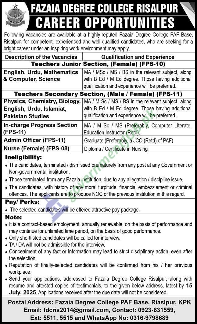 Forward a signed résumé and attested testimonials to Fazaia Degree College, PAF Base Risalpur, or email fdcris2014@gmail.com (tel. 0923-631559 ext. 5511/5515; WhatsApp 0316-9798689) by July 15, 2025.