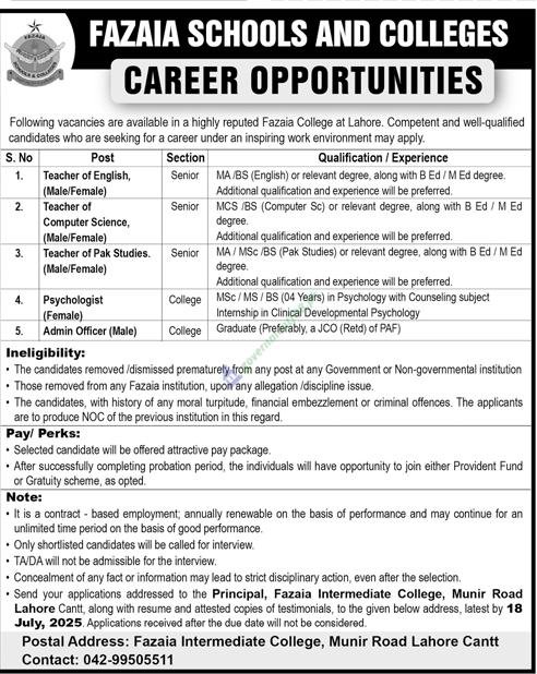 Fazaia Intermediate College Lahore Jobs 2025 invite applications for five contract-to-permanent posts—Teachers of English, Computer Science, and Pakistan Studies (male / female), a female Psychologist, and a male Admin Officer—at the Munir Road campus in Lahore Cantt. Candidates need a relevant master’s or four-year bachelor’s plus B.Ed/M.Ed for teaching slots, an MSc/BS in Psychology with clinical internship for the counseling role, or a graduation-level degree (retired PAF JCO preferred) for administration. Dismissals for misconduct bar eligibility, and a No-Objection Certificate is mandatory for those already employed.