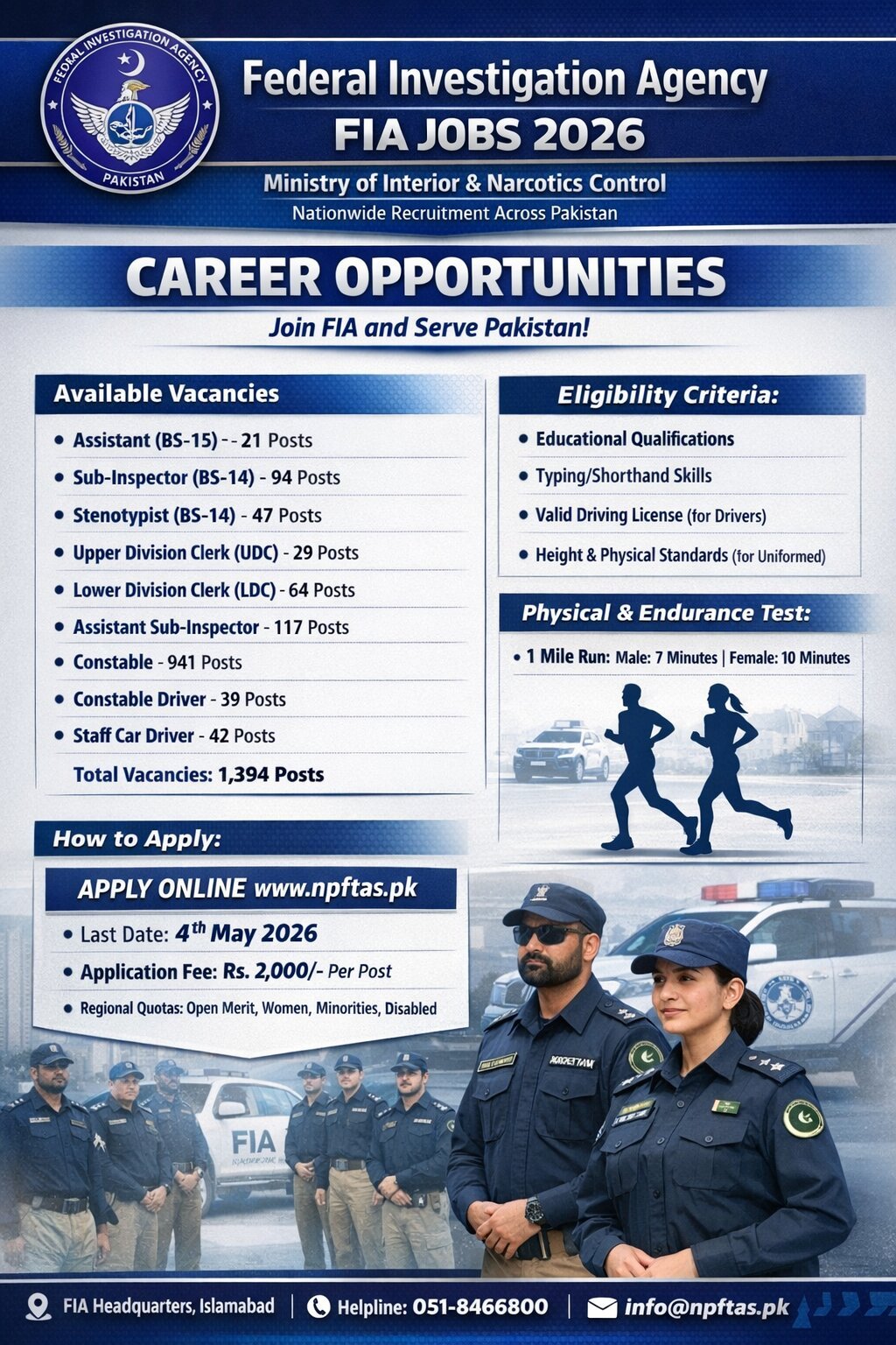The Federal Investigation Agency (FIA), under the Ministry of Interior & Narcotics Control, has announced Nationwide  Career Opportunities for eligible candidates. These are Federal Investigation Agency (FIA) under the Ministry of Interior & Narcotics Control administrator authority offered through a transparent, merit-based recruitment process. The hiring is open to applicants who meet the education, age limit, typing/shorthand (where required), licensing (for drivers), and physical standards mentioned in the following advertisement. If you are motivated to serve in a premier law enforcement organization and can meet the required criteria, you should apply online through the FIA official testing portal (npftas.pk) within the deadline.