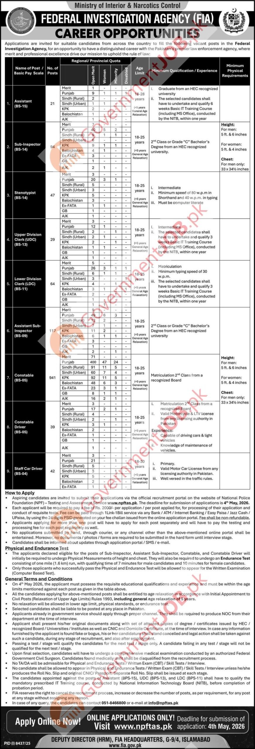 FIA Job Advertisement by www.npftas.pkMinistry of Interior & Narcotics Control — FIA Career Opportunities (Nationwide Recruitment)
