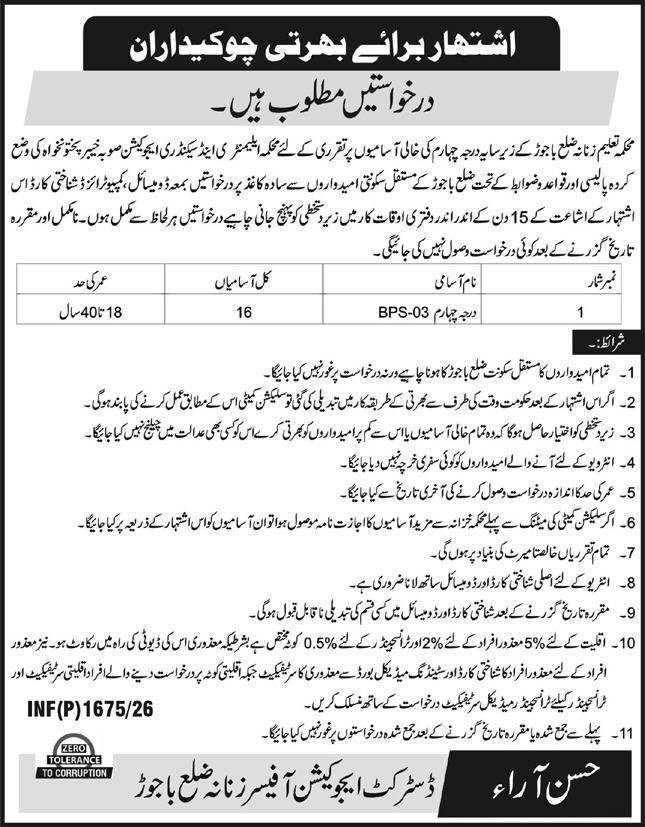 اِشتہار برائے بھرتی چوکیداران — درخواستیں مطلوب ہیں (محکمہ تعلیم ضلع باجوڑ)