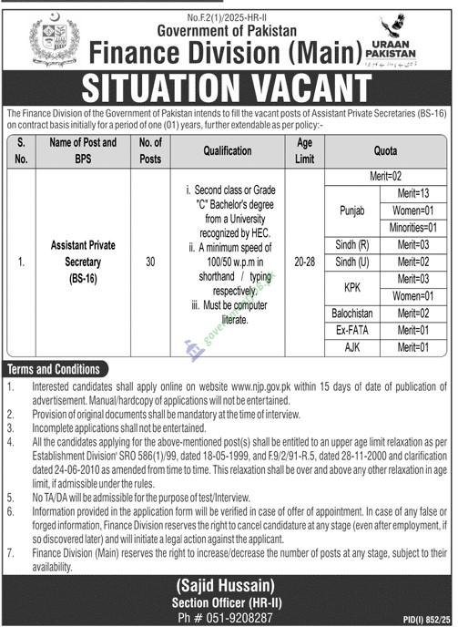 The Finance Division is filling 30 Assistant Private Secretary posts (BS-16)—two on open merit and the rest divided among Punjab, Sindh, KP, Balochistan, Ex-FATA and AJK—for a one-year contract at the Islamabad secretariat, extendable per policy. Applicants must be 20-28 years old, hold a second-class bachelor’s degree, and meet shorthand/typing minimums of 100/50 wpm while demonstrating solid computer skills; government age-relaxation rules apply.