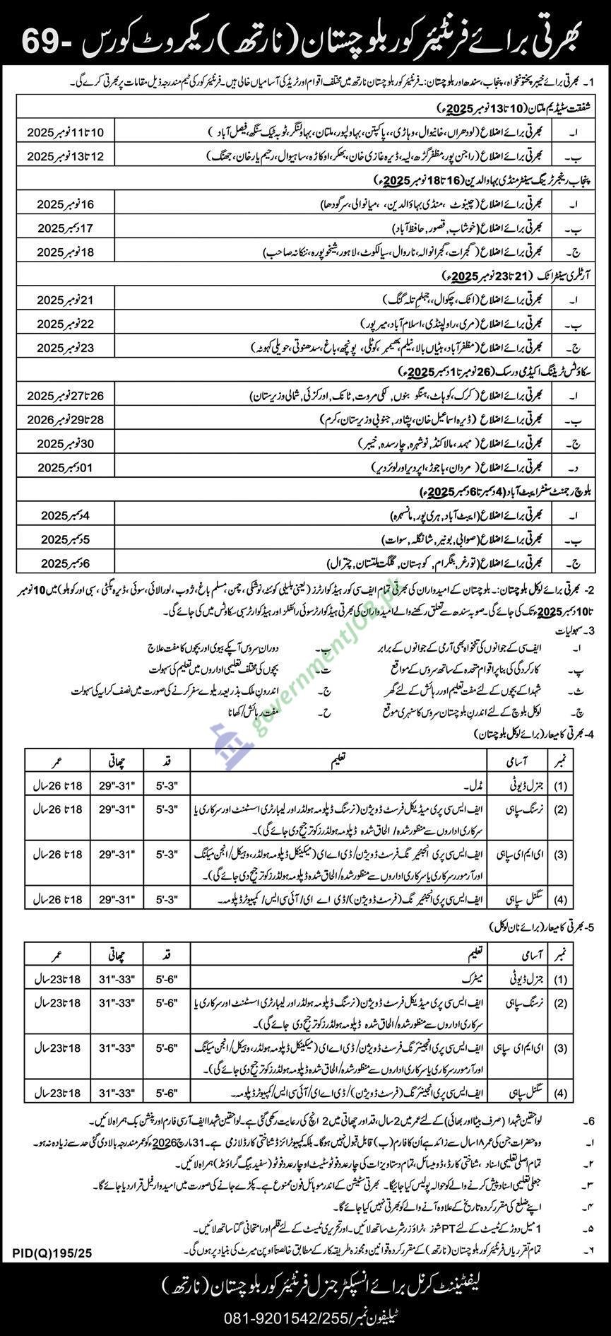 Frontier Corps Balochistan (North) Jobs 2025 – 69th Recruit Course (Sepoy General Duty, Nursing Sepoy, EME Technician, Signal/IT | Janbaz Category Included) – Multan, Mandi Bahauddin, Rawalpindi, Warsak, Abbottabad