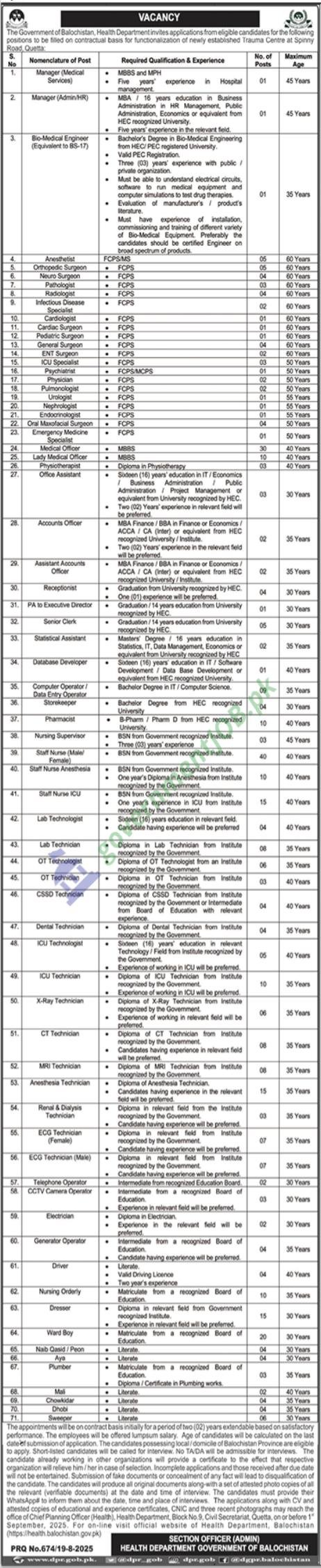 Health Department Balochistan—Trauma Centre, Spinny Road, Quetta (Jobs 2025): The Government of Balochistan is hiring for multiple roles to operationalize the new Trauma Centre at Spinny Road, Quetta on a contract of 02 years (extendable) with lump-sum salaries and merit-based selection. Applicants should file the prescribed documents as per the official notice and ensure delivery by 10 September 2025; age will be calculated on the closing date, only shortlisted candidates will be invited for test/interview, and no TA/DA is admissible. These openings suit candidates seeking Health Department Balochistan jobs 2025 in trauma and emergency services at a government facility in Quetta—review the advertisement for post-wise criteria and submission method, then apply before the deadline to be considered.