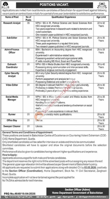 The Home Department Government of Balochistan has invited applications from local/domicile candidates of Balochistan for multiple contract-based vacancies under the Balochistan Centre of Excellence on Countering Violent Extremism (COE-CVE), Home Department, Quetta. These are government sector jobs offered initially for one year, with the possibility of extension based on satisfactory performance. The opportunities are based in Quetta, Balochistan, and are suitable for qualified candidates from fields such as Political Science, International Relations, Social Sciences, Accounting, Media Studies, Cyber Security, Communications, and digital media. This recruitment is a strong option for applicants who want to build a career in public policy support, research, counter extremism, media strategy, digital outreach, and departmental administration.