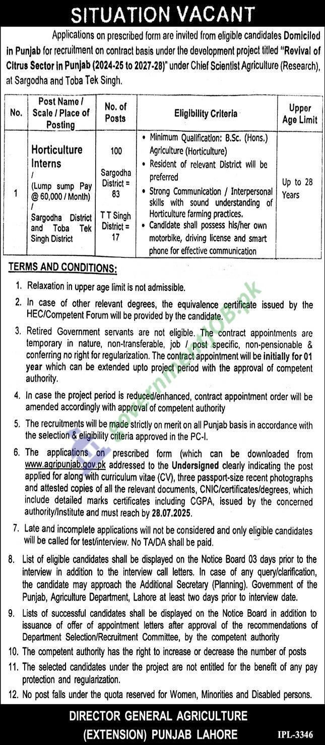 | 1 | Horticulture Interns | 100 | BSc (Hons.) in Agriculture (Horticulture) | PKR 60,000/mo | Sargodha (83), TT Singh (17) |