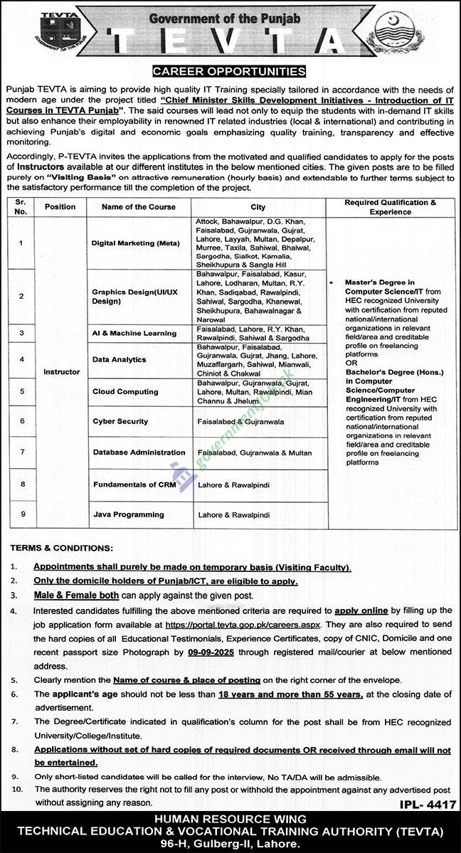 TEVTA Punjab is hiring visiting/contractual (hourly) Instructors across major cities in Punjab for high-demand IT courses including Digital Marketing (Meta), Graphics/UI-UX, AI & Machine Learning, Data Analytics, Cloud Computing, Cyber Security, Database Administration, CRM, and Java. Applicants need a Master’s in CS/IT (HEC-recognized) or Bachelor’s (Hons.) in CS/CE/IT with relevant certifications, plus a strong freelancing or industry track record; roles are open to men and women aged 18–55 with Punjab/ICT domicile. Apply online via the TEVTA careers portal, then courier attested documents to the HR Wing, TEVTA Lahore; email submissions are not accepted. These placements let working professionals teach part-time in leading institutes while building academic credentials. The application deadline is 09 September 2025, so align your chosen course and city with your expertise and availability.
