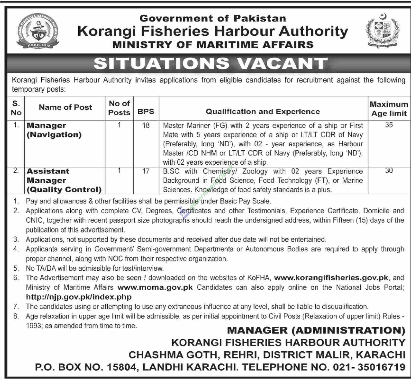 Korangi Fisheries Harbour Authority Jobs 2025 – Manager (Navigation) & Assistant Manager (Quality Control)