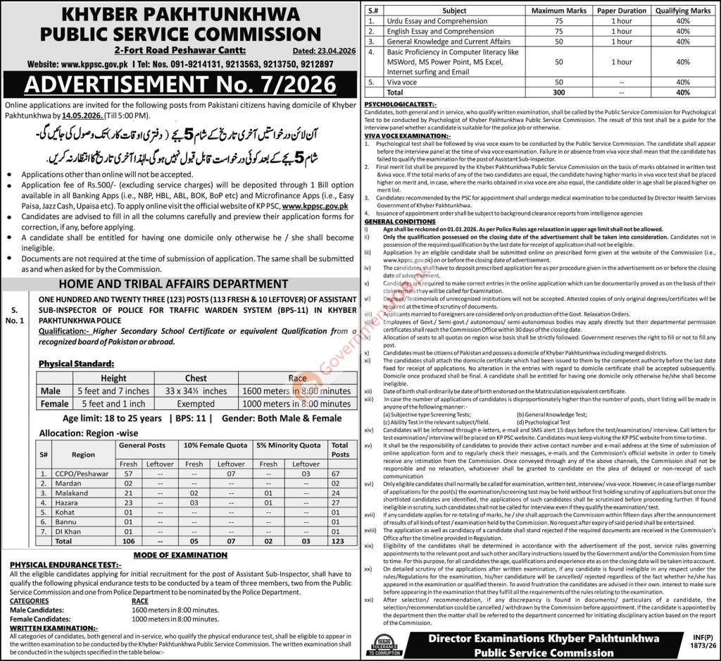 Khyber Pakhtunkhwa Public Service Commission (KPPSC) has announced Advertisement No. 7/2026 for the recruitment of Assistant Sub-Inspector of Police for Traffic Warden System (BPS-11) in the Khyber Pakhtunkhwa Police Department under the Home and Tribal Affairs Department. These are government sector police jobs for eligible Pakistani citizens having domicile of Khyber Pakhtunkhwa. Candidates with Higher Secondary School Certificate (HSSC) or equivalent qualification, strong physical fitness, and interest in serving in the police traffic system can apply online before the closing date.