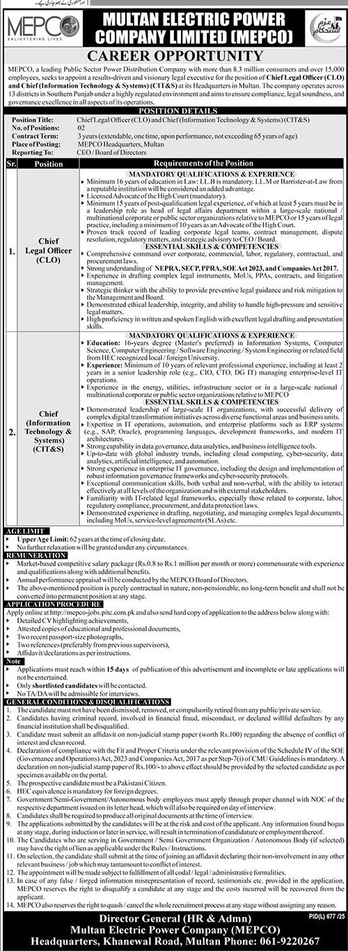 ![MEPCO Jobs 2025 — Chief Legal Officer (CLO) & Chief (Information Technology & Systems) [CIT&S] | Multan Electric Power Company Limited](https://governmentjob.pk/wp-content/uploads/2025/10/MEPCO.jpg)