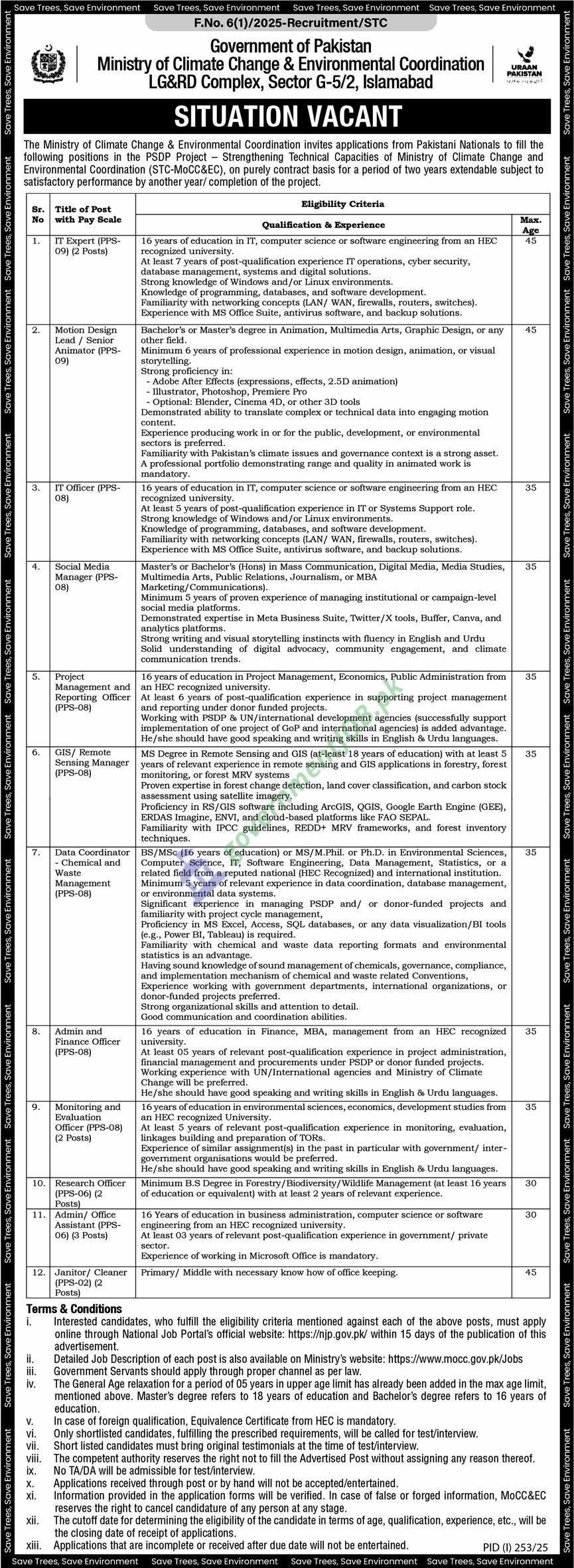 The Ministry of Climate Change & Environmental Coordination’s STC project needs a fresh round of specialists in Islamabad—from IT Experts and Motion Designers (PPS-09, age up to 45, seven and six years’ experience respectively) to mid-range IT, Social-Media, GIS, M&E, and Admin & Finance Officers (PPS-08, age cap 35, five years’ relevant work), plus field-based Research Officers (PPS-06, age 30, BS Forestry/Wildlife, two years’ practice) and essential support staff; each post is a two-year contract, extendable by one and must be applied for online through the National Job Portal within 15 days of the advertisement—hand-delivered or incomplete files are dropped, and only shortlisted candidates move to interview.