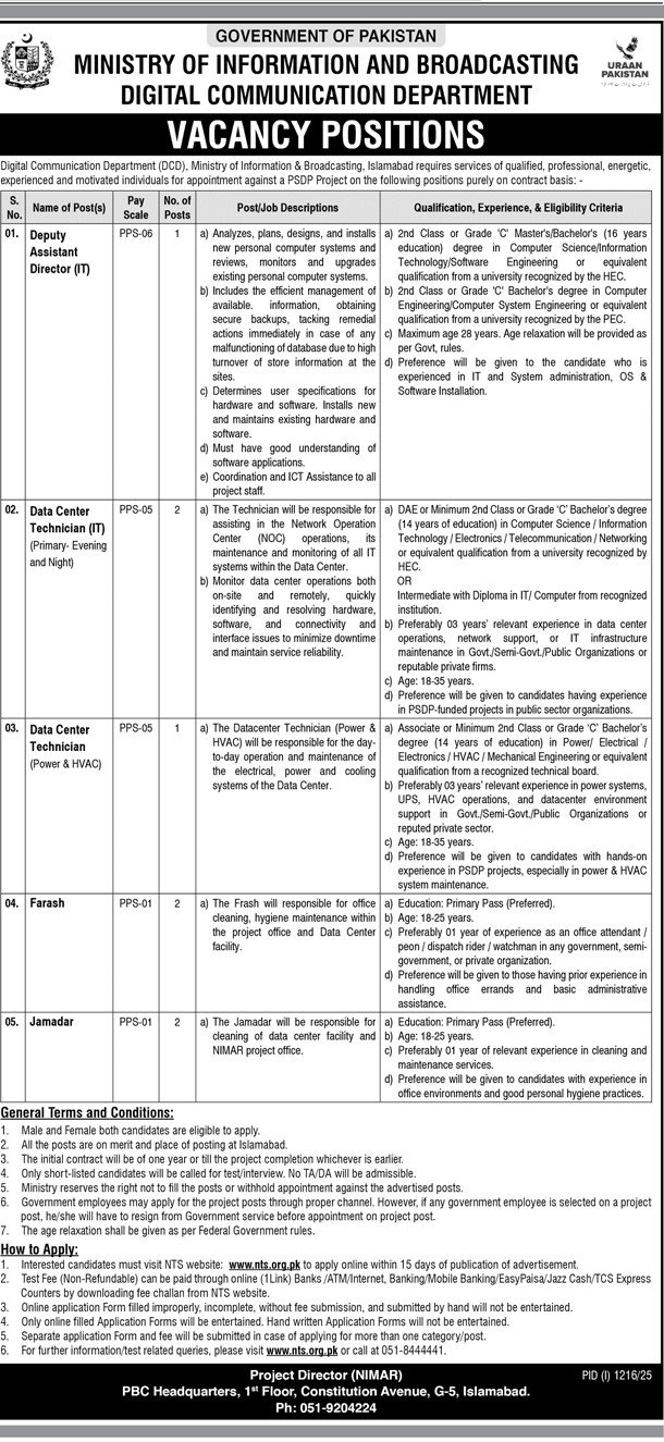 Ministry of Information & Broadcasting — Digital Communication Department (PSDP Project), Islamabad: The MOIB’s Digital Communication Department is hiring on a contract basis for Islamabad, offering PPS-06, PPS-05, and PPS-01 positions with equal opportunity for men and women: Deputy Assistant Director (IT) PPS-06 (1 post) to plan/install IT systems, manage backups and security, and support upgrades; Data Center Technician (IT) — Primary/Evening/Night PPS-05 (2 posts) to assist NOC operations, monitor platforms, and resolve connectivity, hardware, and software issues; Data Center Technician (Power & HVAC) PPS-05 (1 post) to maintain electrical, power, and cooling for the facility; Farash PPS-01 (2 posts) and Jamadar PPS-01 (2 posts) for office and data-center hygiene.