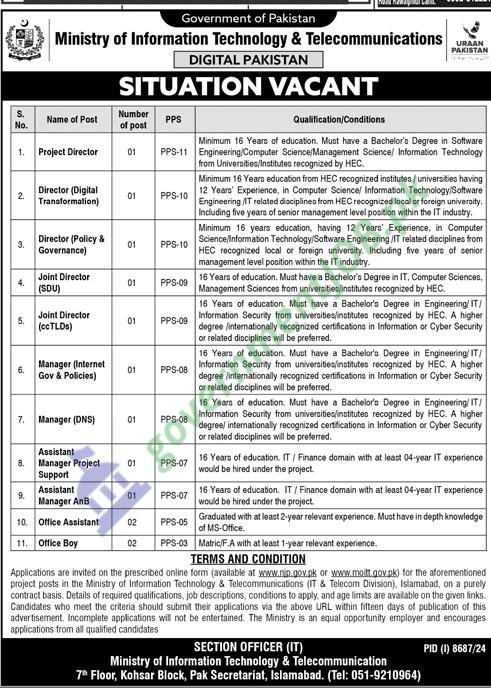The Ministry of Information Technology & Telecommunication (MoITT), under the Government of Pakistan, is inviting highly qualified, forward-thinking, and results-driven professionals to apply for a series of strategic and technical positions under the Digital Pakistan initiative. These are project-based roles funded under the Public Sector Development Program (PSDP), designed to accelerate national progress in digital transformation, cybersecurity, internet governance, and public sector IT infrastructure.