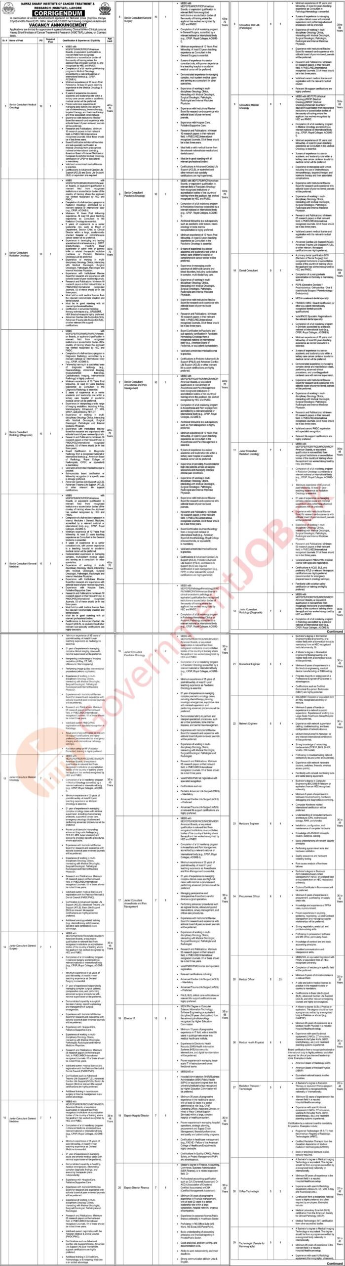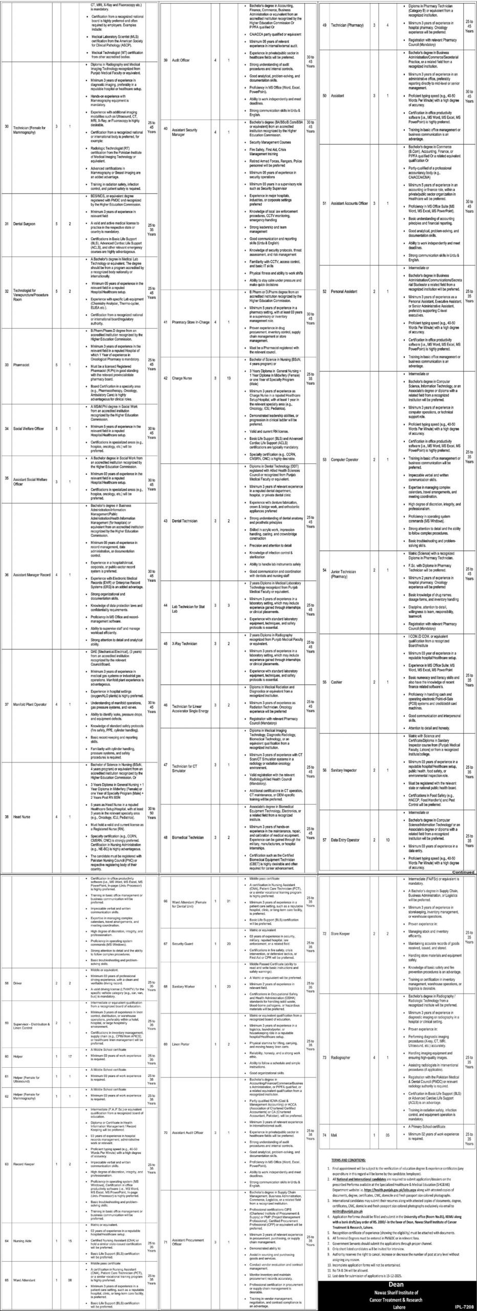 The Nawaz Sharif Institute of Cancer Treatment & Research (NSICTR), Lahore has issued a Corrigendum – Vacancy Announcement inviting online/official applications for a large intake across clinical, diagnostic, nursing, allied health, administration, and engineering streams. Openings span senior and mid-career titles including Senior Consultant (Surgical Oncology, Medical Oncology, Radiation Oncology, Anesthesiology, Radiology, Pathology, Pediatric Oncology), Consultant, Junior Consultant/Registrar, Medical Officer/House Officer, Nursing (staff nurses, head nurses), Allied Health (pharmacy, radiology/medical imaging, laboratory, blood bank, physiotherapy, oncology technicians), and Corporate Services (hospital administration, quality & patient safety, biomedical, IT/network, finance, HR, supply chain, facilities/maintenance). Most posts are full-time and based at the NSICTR campus in Lahore, Punjab, Pakistan.
