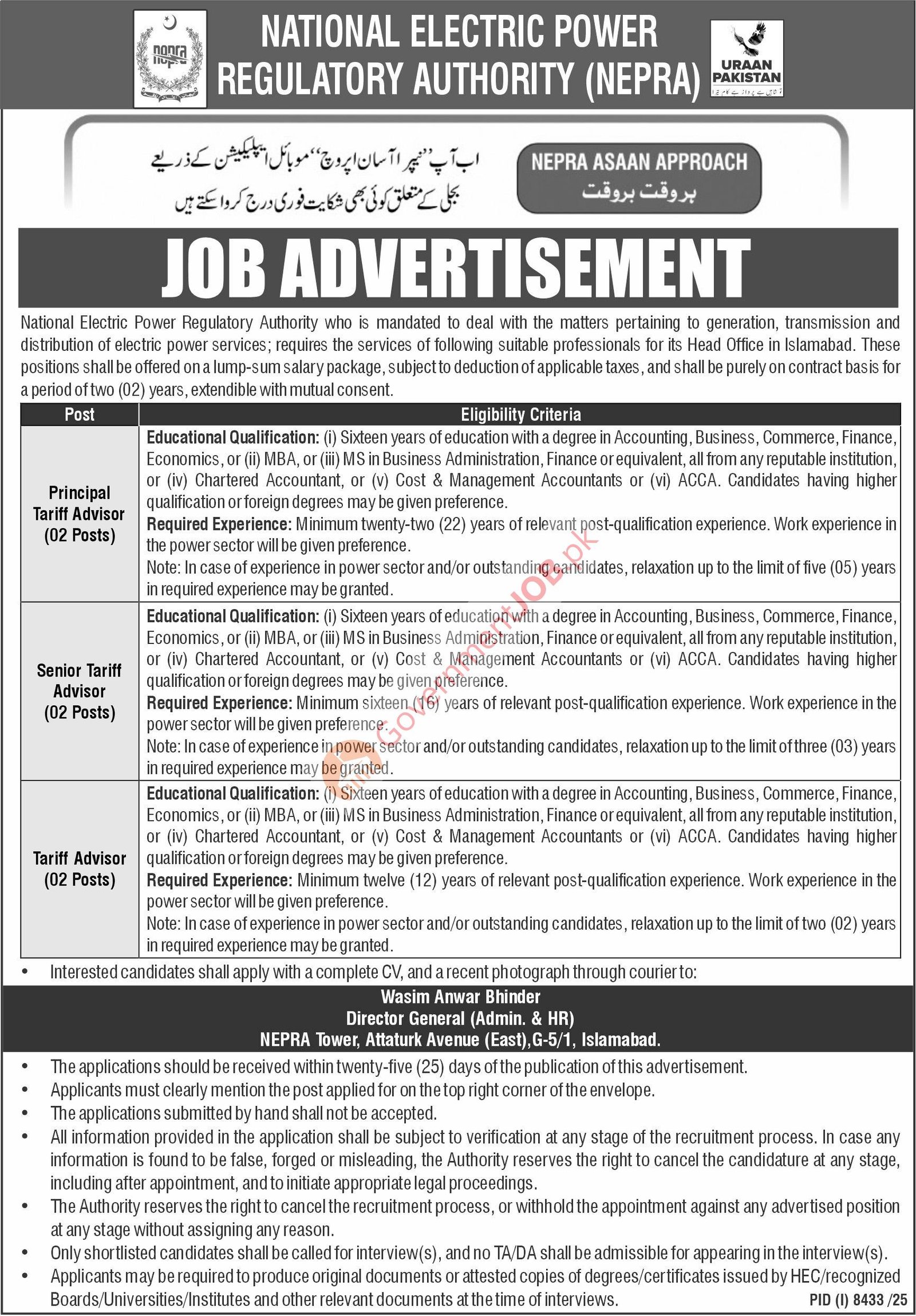 | Principal Tariff Advisor | 02 | Sixteen years of education with a degree in Accounting, Business, Commerce, Finance, Economics, or MBA, or MS in Business Administration / Finance or equivalent, or Chartered Accountant, or Cost & Management Accountant, or ACCA, from any reputable institution | Minimum 22 years of relevant post-qualification experience | Power sector experience will be preferred. Candidates with higher qualification or foreign degrees may be given preference. In case of experience in the power sector and/or outstanding candidates, relaxation up to 05 years in required experience may be granted |