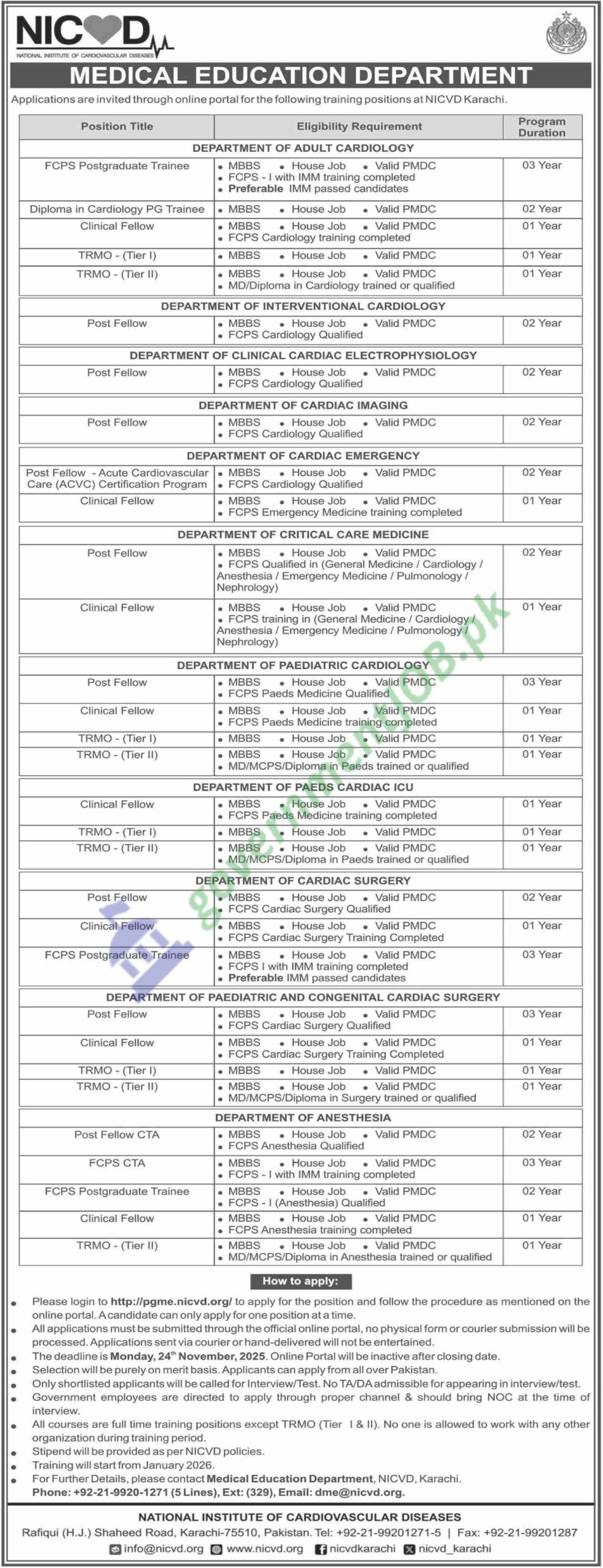 FCPS Postgraduate Trainee, Clinical Fellow, TRMO & Post-Fellow Programs — NICVD Karachi Jobs (Medical Education Department)