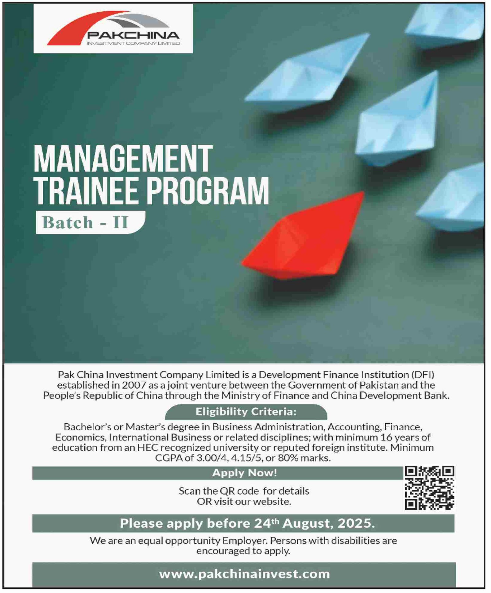 Apply via www.pakchinainvest.com by August 24, 2025 with an updated CV, degree certificates and transcripts, CNIC, and a recent photograph; candidates with up to two years’ experience may be considered, and successful trainees may progress to regular roles subject to performance and organizational needs—making the Pak China Investment Company Limited Management Trainee Program 2025 a solid first step into Pakistan’s DFI sector.