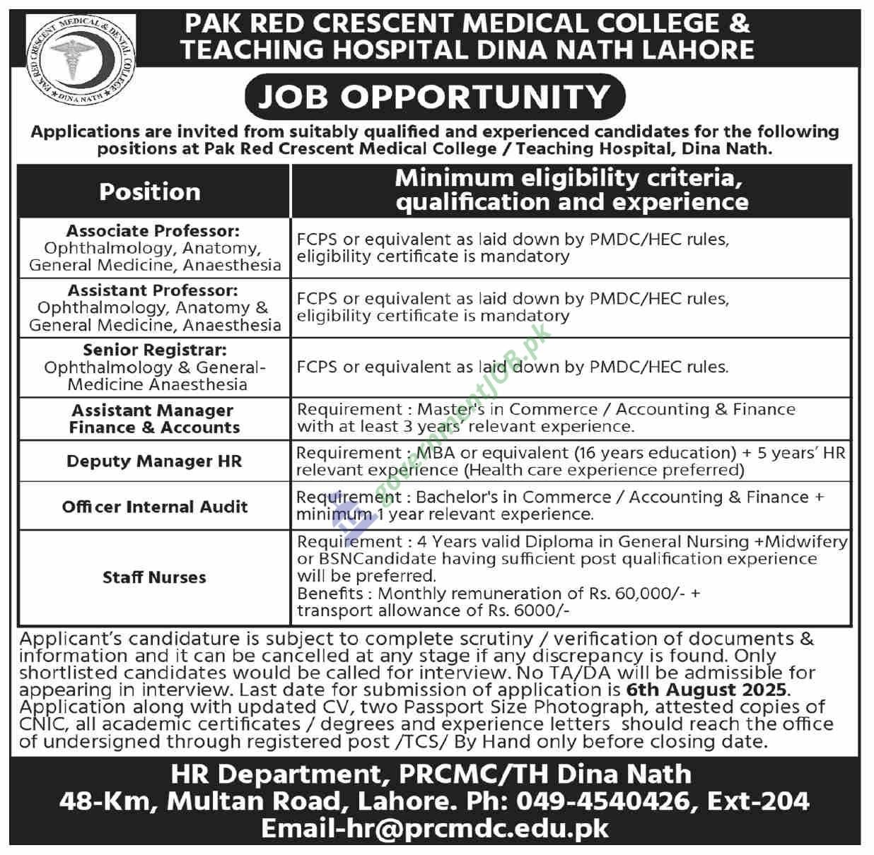 Pak Red Crescent Medical College & Teaching Hospital in Dina Nath, 48 km Multan Road, Lahore is hiring academic, clinical, and administrative talent—including **Associate and Assistant Professors (Ophthalmology, Anatomy, General Medicine, Anaesthesia), Senior Registrars, an MBA‑level Deputy Manager HR, an Assistant Manager Finance & Accounts, an Internal Audit Officer, and Staff Nurses who will earn PKR 60,000 plus a PKR 6,000 transport allowance—to strengthen its faculty, patient care, and governance frameworks; candidates holding FCPS‑equivalent credentials, business or finance master’s degrees, or four‑year nursing diplomas should courier or hand‑deliver a complete dossier (CV, photos, attested CNIC, degrees, and experience letters) to the HR Department or email hr@prcmdc.edu.pk no later than 6 August 2025, as incomplete or falsified submissions will be rejected and only shortlisted applicants will be called without TA/DA.