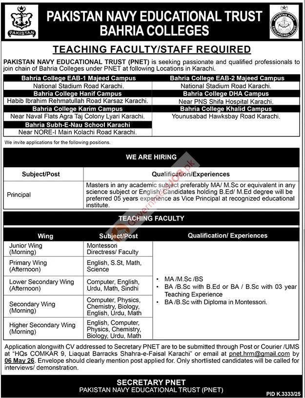 Pakistan Navy Educational Trust (PNET) has announced fresh teaching faculty and staff jobs in Karachi for 2026 for motivated, qualified, and career-focused professionals who want to work in the education sector. These vacancies are available for multiple Bahria Colleges and affiliated campuses in Karachi, making this an attractive opportunity for candidates interested in school education jobs, faculty careers, academic administration, and subject teaching roles. The institution is inviting applications from individuals with relevant academic qualifications, classroom teaching ability, leadership exposure, and professional experience. Candidates with degrees such as MA, MSc, BS, BA, BSc, B.Ed, M.Ed, and Montessori or teaching-related diplomas may find these openings suitable, depending on the role and wing.