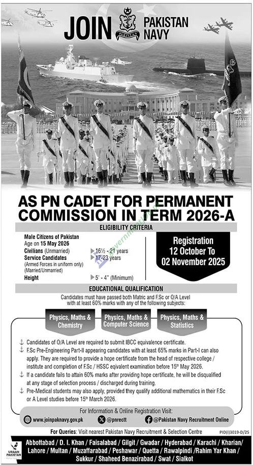 Join Pakistan Navy as PN Cadet for Permanent Commission 2026-A—an excellent opportunity for motivated male citizens of Pakistan to begin a professional naval career with long-term growth, world-class training, and national service. The Pakistan Navy (Recruitment & Selection Directorate) invites unmarried civilian candidates (16½–21 years) and service candidates from the Armed Forces (17–23 years; married/unmarried as per service rules) to register from 12 October to 02 November 2025. The role is a full-time, permanent commission that begins with cadet training and leads to officer appointment in core naval branches. Eligible applicants must have Matric and F.Sc./O-Level/A-Level with at least 60% marks in one of the following subject groups: Physics–Maths–Chemistry, Physics–Maths–Computer Science, or Physics–Maths–Statistics.