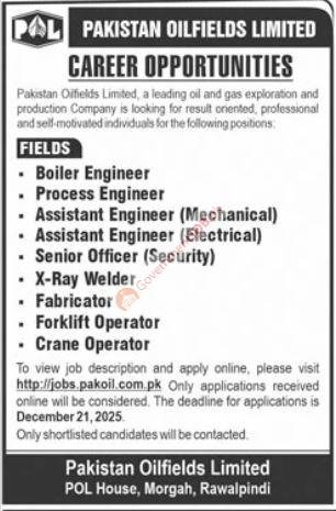 Pakistan Oilfields Limited (POL) has announced career opportunities for field positions for result-oriented, professional, and self-motivated candidates. The vacancies include Boiler Engineer, Process Engineer, Assistant Engineer (Mechanical), Assistant Engineer (Electrical), Senior Officer (Security), X-Ray Welder, Fabricator, Forklift Operator, and Crane Operator. These roles are advertised as field-based jobs under Pakistan’s leading exploration and production company, with online applications only and shortlisting based on suitability for the role.