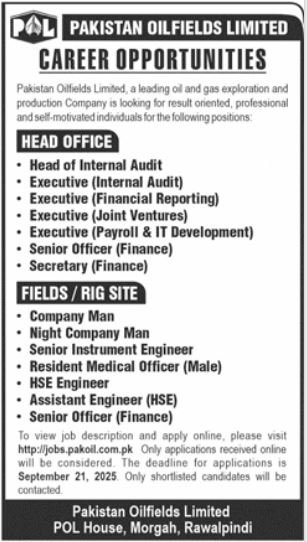 Pakistan Oilfields Limited (POL)—a leading, integrated oil & gas exploration and production company—has announced fresh career opportunities for results-driven professionals at its Head Office (Rawalpindi) and Field/Rig Site locations. The hiring round covers finance, audit, IT/payroll, HSE, instrumentation, medical, and field operations tracks. Appointments are merit-based and applications are accepted online only through POL’s careers portal. If you’ve been searching for POL jobs 2025, oil & gas rig site jobs, or finance/audit roles in Rawalpindi, this intake is worth your attention. ✅