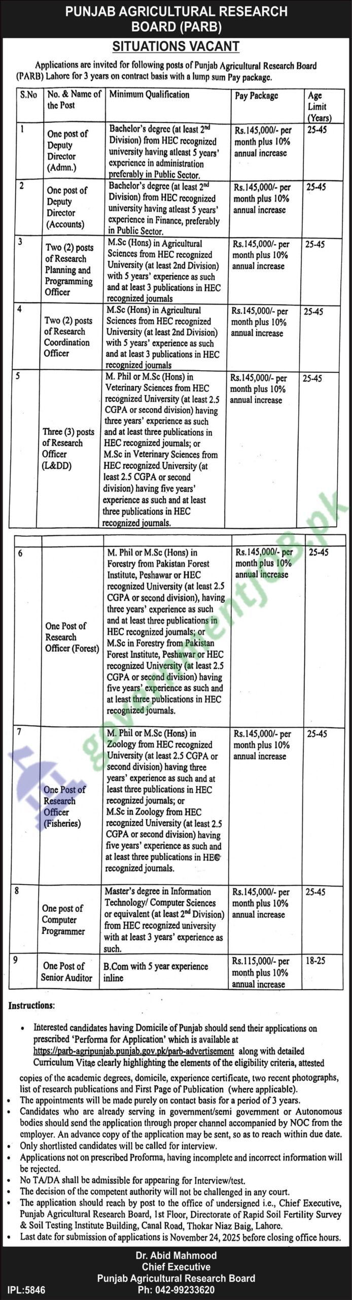 The Punjab Agricultural Research Board (PARB), Lahore has announced a fresh hiring drive on a three-year contract (lump-sum pay package with 10% annual increase) for multiple roles: Deputy Director (Administration), Deputy Director (Accounts), Research Planning & Programming Officer, Research Coordination Officer, Research Officer (L&DD), Research Officer (Forest), Research Officer (Fisheries), Computer Programmer, and Senior Auditor. These PARB jobs 2025 are open to candidates having domicile of Punjab with the required qualifications and experience. Duty station is Lahore with project-based assignments across Punjab as needed.