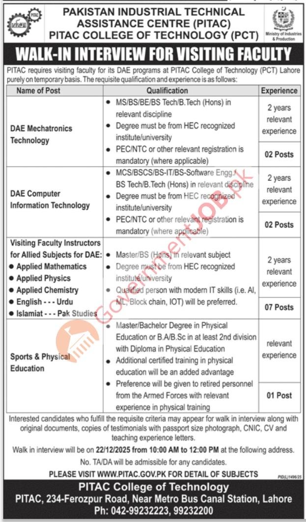 The Pakistan Industrial Technical Assistance Centre (PITAC)—under the Ministry of Industries & Production—has announced walk-in interviews for visiting faculty at PITAC College of Technology (PCT), Lahore. Openings are available for DAE Mechatronics Technology (02 posts), DAE Computer Information Technology (02 posts), Visiting Faculty Instructors for Allied Subjects—Applied Mathematics, Applied Physics, Applied Chemistry, English/Urdu, Islamiat/Pak Studies—(07 posts), and Sports & Physical Education (01 post). These are purely temporary, visiting positions meant to support day and evening DAE classes. The walk-in will be held on 22 December 2025, 10:00 AM–12:00 PM, at PITAC College of Technology, 234-Ferozepur Road, Near Metro Bus Canal Station, Lahore. The primary keyphrase for this announcement is PITAC visiting faculty jobs Lahore.