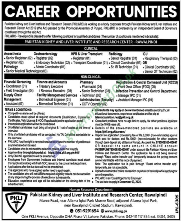 PKLI Rawalpindi Jobs 2025 – Clinical & Non-Clinical Staff (Pakistan Kidney and Liver Institute & Research Center)