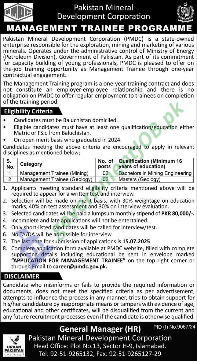 Pakistan Mineral Development Corporation is opening its doors to four bright graduates from Balochistan, offering a year-long Management Trainee stint in Mining Engineering and Geology that pays a generous PKR 80,000 per month and places you at the heart of the corporation’s Islamabad headquarters. If you earned your bachelor’s in Mining Engineering or master’s in Geology during 2024, completed your early schooling in the province, and are hungry to swap textbook theory for field surveys, reserve estimates, and safety drills. Over twelve months you’ll rotate through exploration camps, lab analysis suites, and planning meetings—learning how Pakistan’s most influential minerals agency turns raw data into dig-ready decisions—before wrapping up with a résumé full of real-world accomplishments and a network of mentors across the Ministry of Energy. To be in the running, download the form from the PMDC site, label your envelope “APPLICATION FOR MANAGEMENT TRAINEE,” and email or post it so it lands by 15 July 2025; selections hinge on academic record, test score, and interview poise, with no travel allowance for the assessment rounds.