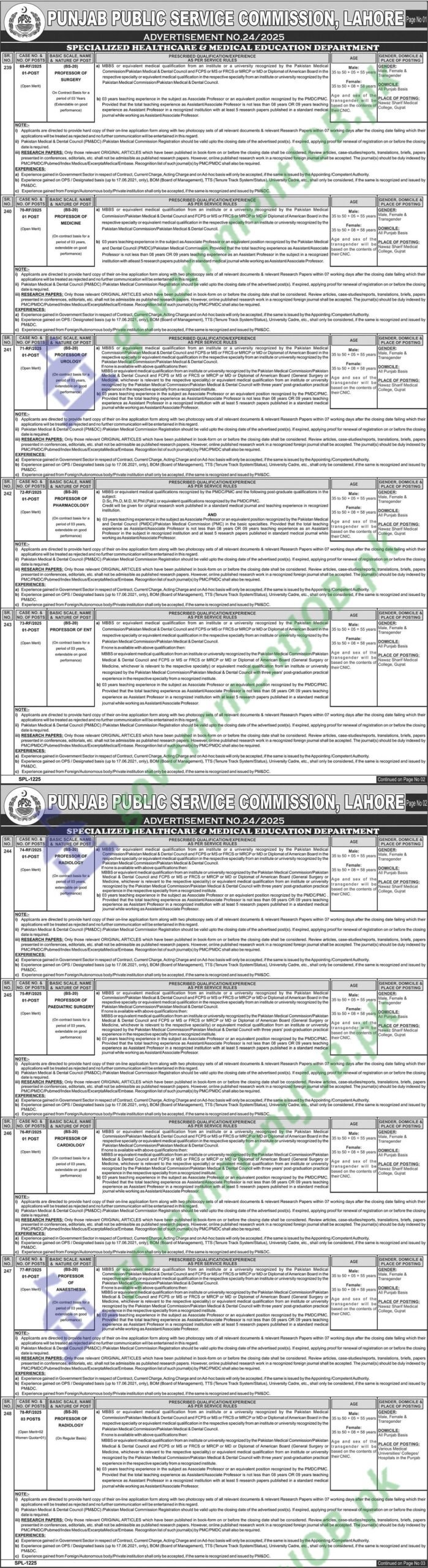 PPSC Multiple Professor Positions (BPS-20) – Specialized Healthcare & Medical Education Department, Punjab