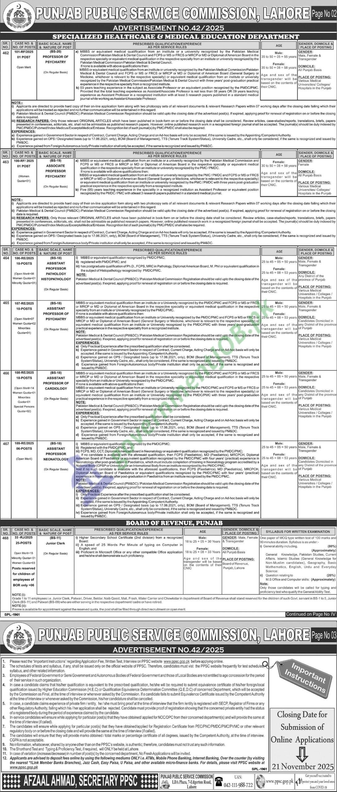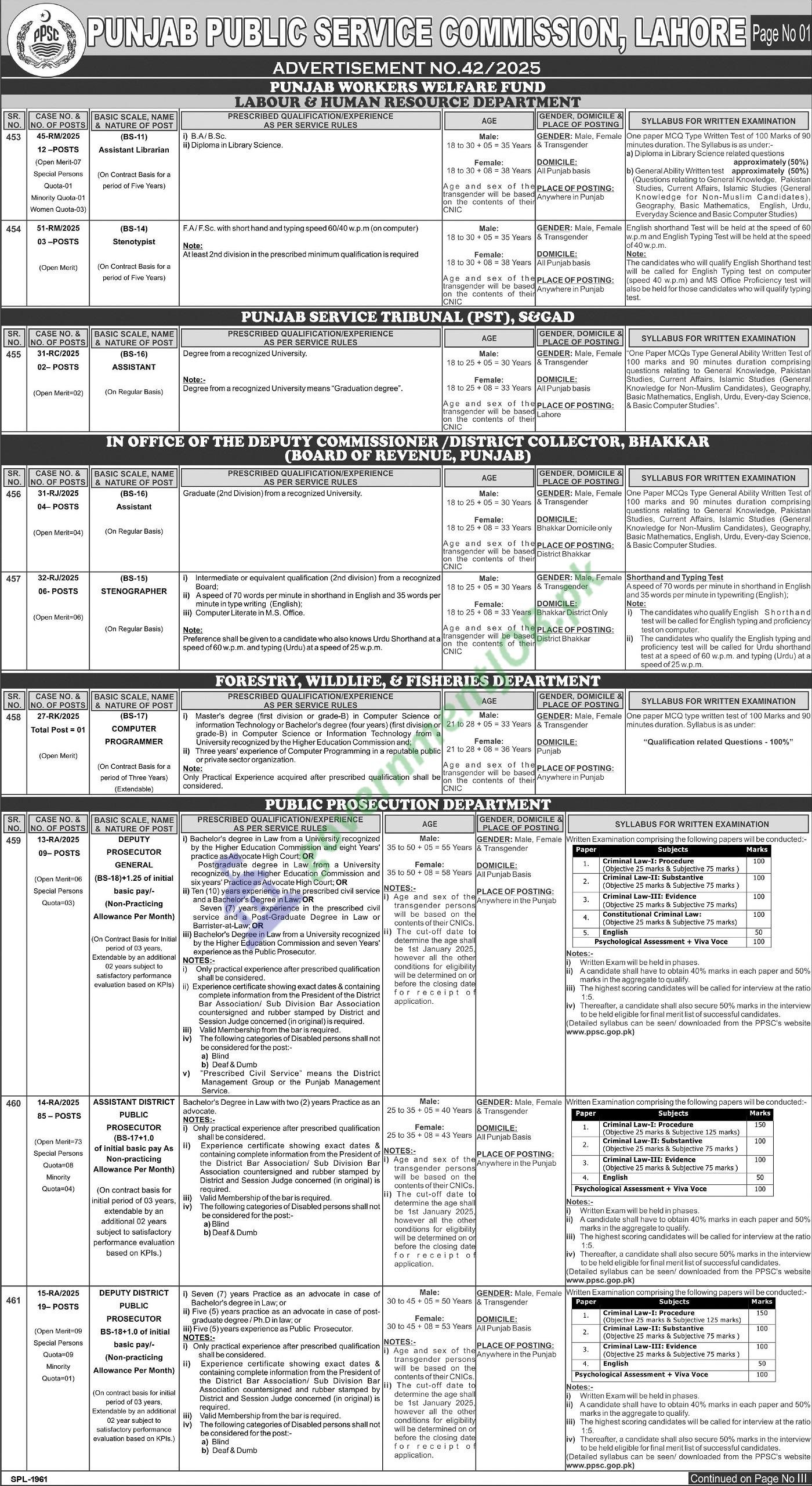 The Punjab Public Service Commission, Lahore (PPSC) has announced Advertisement No. 42/2025, inviting applications across several departments for numerous posts including Assistant Librarian, Stenotypist, Assistant (BS-16), Stenographer, Computer Programmer (BS-17), Deputy/Assistant District Public Prosecutors, Professor/Assistant Professor (various specialties), and Junior Clerk, among others. These positions are primarily on regular basis with a few on contract as mentioned below. The jobs are located across Punjab and are open to male, female, and transgender candidates in line with PPSC policy.