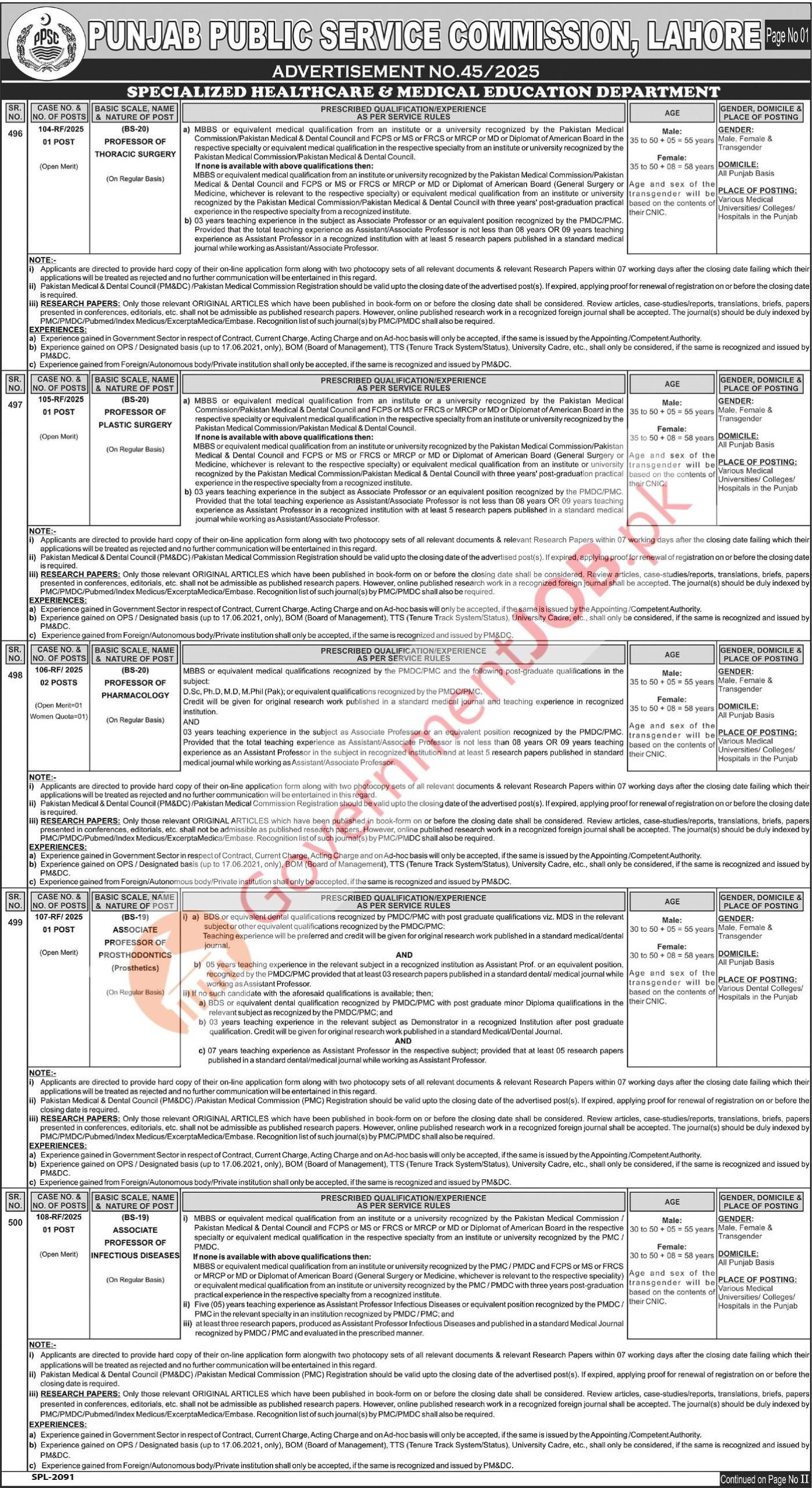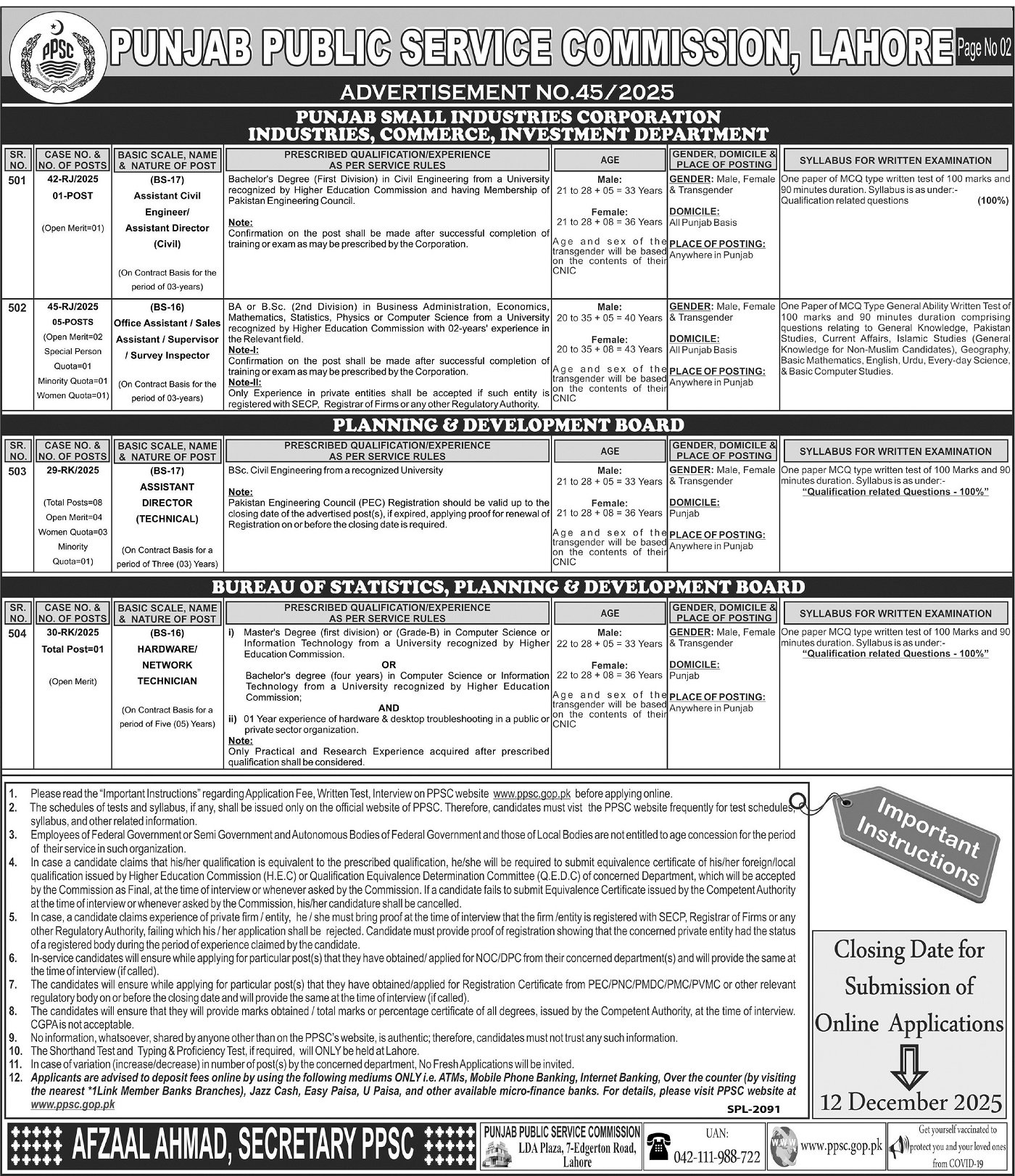 Looking for the latest PPSC jobs 2025 with a clear path to apply online? The Punjab Public Service Commission (PPSC), Lahore has announced Advertisement No. 45/2025 featuring multiple vacancies in the Specialized Healthcare & Medical Education Department, Punjab Small Industries Corporation (Industries, Commerce & Investment Department), the Planning & Development Board, and the Bureau of Statistics (P&D Board). Openings include Professor of Thoracic Surgery, Professor of Plastic Surgery, Professor of Pharmacology, Associate Professor of Prosthodontics, Associate Professor of Infectious Diseases, Assistant Civil Engineer/Assistant Director (Civil), Office Assistant/Sales Assistant/Supervisor/Survey Inspector, Assistant Director (Technical) and Hardware/Network Technician. All posts are on regular or contract basis (as specified), domiciled for Punjab, and will be filled through the PPSC’s merit-based selection process. This comprehensive guide covers eligibility, age limits, syllabus, quotas, application steps, and the closing date so you can submit a complete application with confidence.