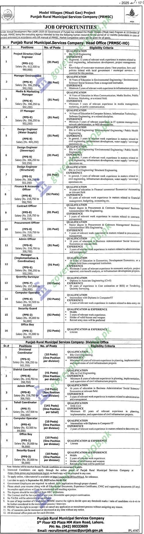 The Punjab Rural Municipal Services Company (PRMSC) is hiring for the Model Villages (Misali Gao) Project 2025 under the Government of Punjab’s ADP 2025–26, placing engineers, technical specialists, managers, IT/finance staff, and project support on 12-month contracts (renewable) at the Head Office, Lahore, and divisional offices across Punjab; pay is market-competitive and post-based. Applicants should follow the method stated in the official notice and file a complete set of documents within 15 days of the advertisement’s publication, clearly mentioning the project and the post applied for so their application is processed without delay.