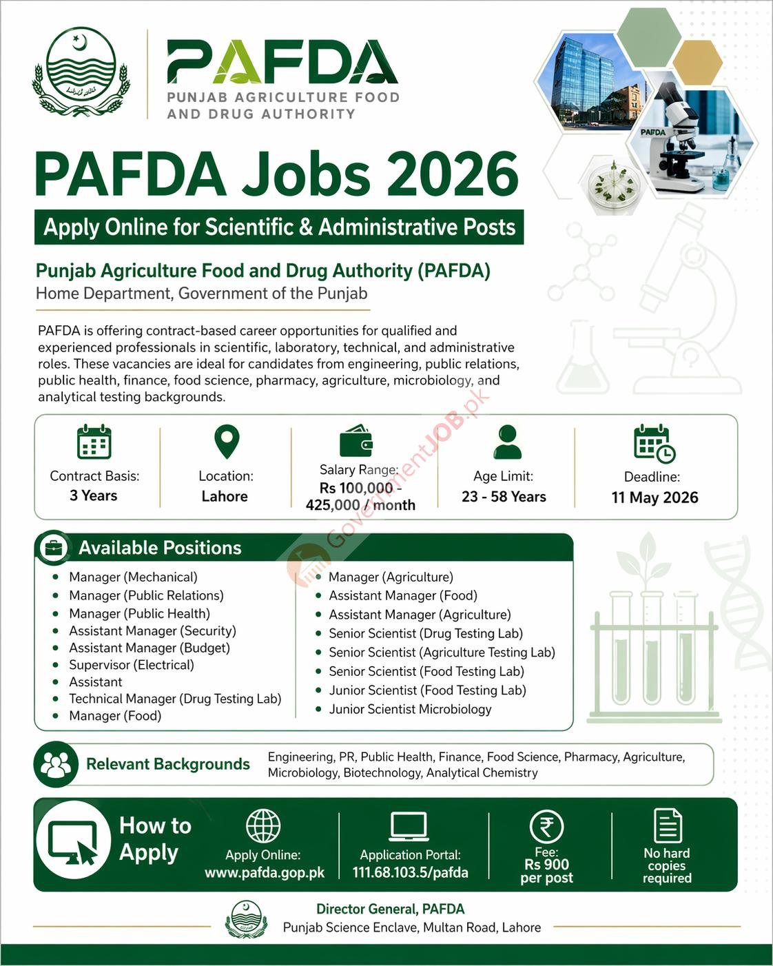 Punjab Agriculture Food and Drug Authority (PAFDA), Home Department, Government of the Punjab has announced new PAFDA Jobs 2026 for highly qualified, skilled, and experienced professionals seeking careers in the forensic examination, testing, quality control, public sector scientific research, food safety, agriculture testing, and drug analysis sector. These vacancies are being offered on a contract basis for an initial period of three years and are suitable for applicants from engineering, public relations, health management, finance, administration, laboratory sciences, microbiology, pharmaceuticals, food science, agriculture, and analytical testing backgrounds. Candidates who meet the required qualification, age limit, post-specific experience, computer skills, and relevant laboratory or administrative expertise should apply through the official online method mentioned in the advertisement.