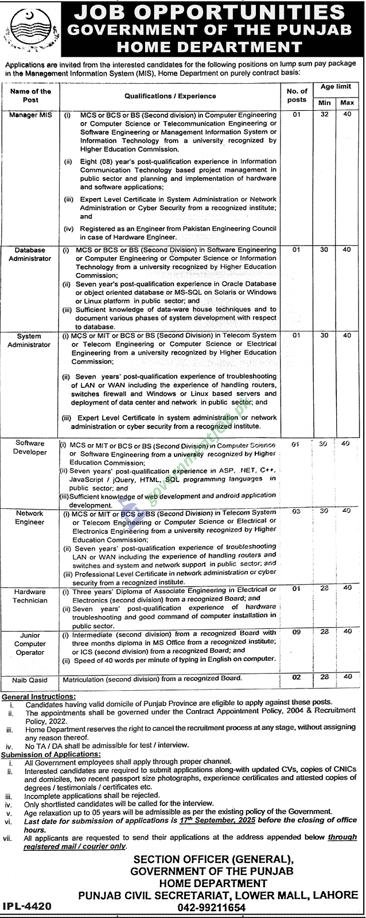 Punjab Home Department Jobs 2025 – Latest MIS & IT Vacancies
