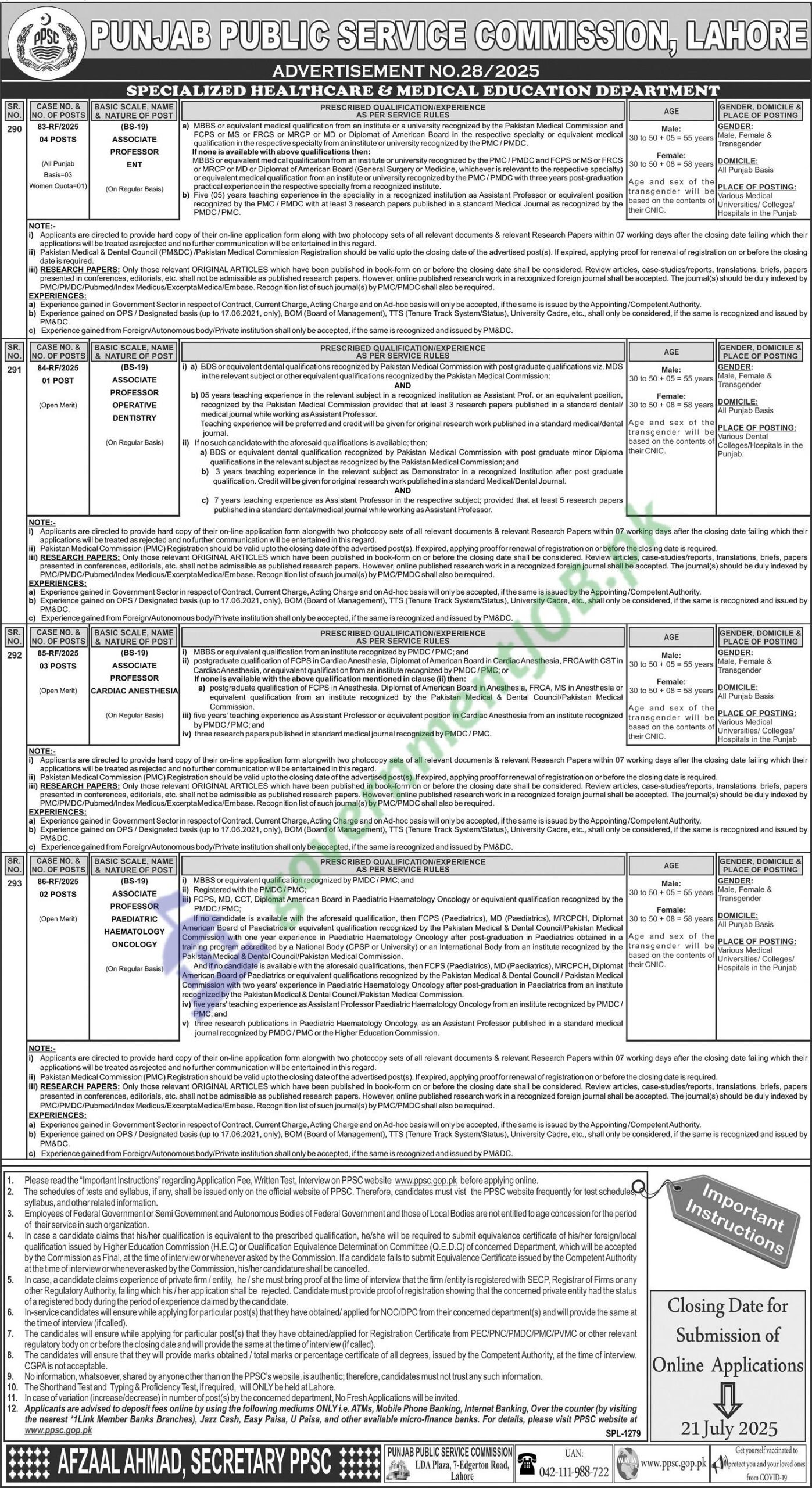 PPSC Job Advertisement No. 28/2025 invites senior clinicians to claim six regular BS-19 Associate-Professor seats—four in ENT, one in Cardiac Anaesthesia and one in Paediatric Haematology-Oncology—across Punjab’s government teaching hospitals and medical colleges. Eligible doctors must combine an MBBS plus an FCPS/FRCS/FRCA/MS/MD (as relevant), five years’ service as Assistant Professor, and at least five peer-reviewed publications, while age limits sit at 30-50 years for men and 33-53 years for women and transgender applicants.