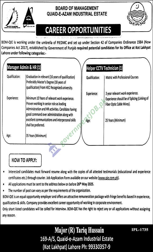 Board of Management Quaid-e-Azam Industrial Estate (BOM-QIE), working under PIEDMC and registered under Section 42 Companies Ordinance, 1984 (now Companies Act 2017), invites application from talented and career-oriented professionals. The organization, set up by the Government of Punjab, works with utmost efficiency towards industrialization and is providing better career prospects in its Kot Lakhpat, Lahore office.