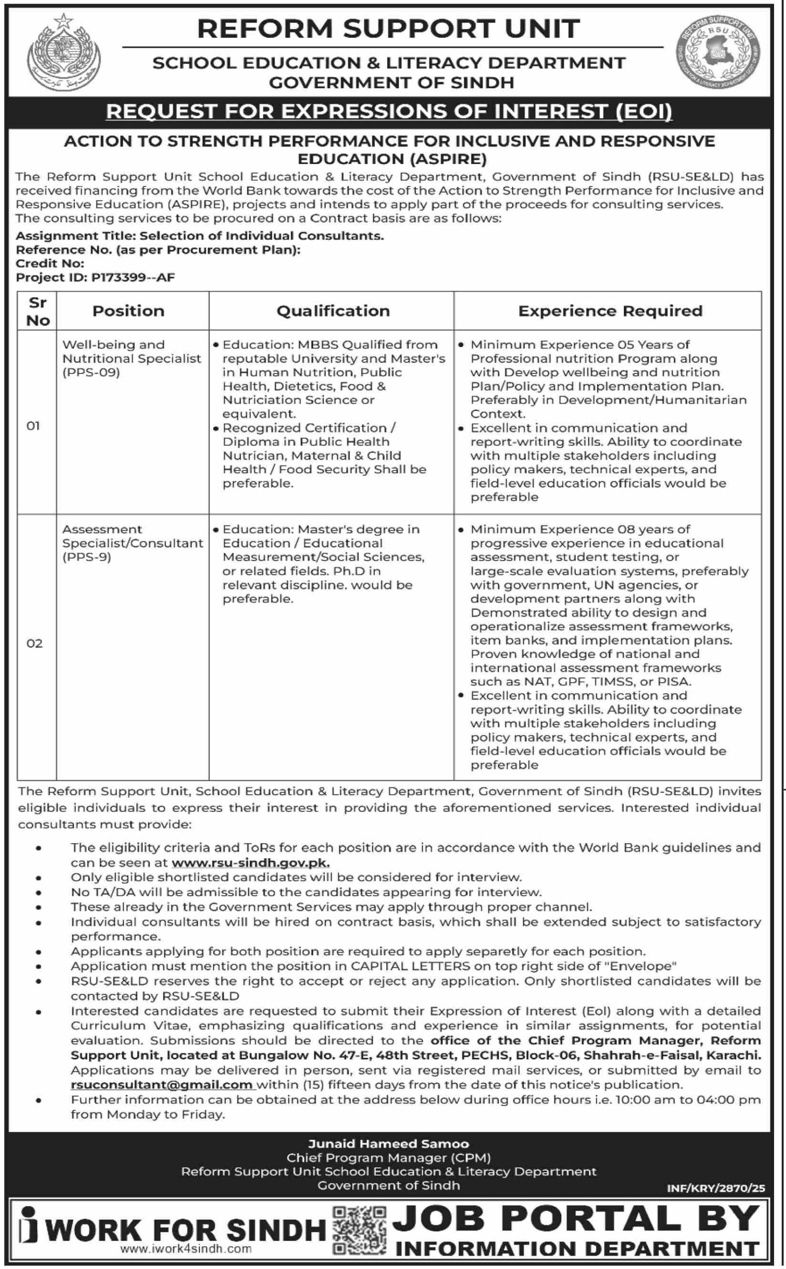 The Reform Support Unit (RSU) of the School Education & Literacy Department (SE&LD), Government of Sindh invites Expressions of Interest (EOI) from qualified individual consultants for two senior roles under the World Bank-supported initiative Action to Strengthen Performance for Inclusive and Responsive Education (ASPIRE). Openings include Well-Being & Nutritional Specialist (PPS-09) and Assessment Specialist/Consultant (PPS-09), to be engaged on a contract basis in Karachi, Sindh. These roles focus on education sector performance, student well-being and nutrition planning, and large-scale assessment reform across Sindh. (Keyphrase: “Reform Support Unit Sindh jobs PPS-09 — Well-Being & Nutrition Specialist and Assessment Specialist in Karachi”)